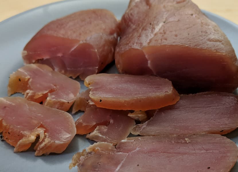 У нас получилась восхитительная вяленина, которую надо нарезать прозрачными кусочками и есть просто так, на бутерброде или под хорошее пиво (вариант — виски).