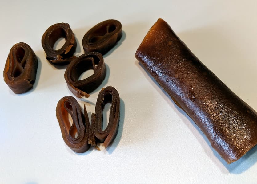 Через 4-5 часов при температуре 55 °C мы получим тонкий лист, который удобно свернуть в трубочку и нарезать на маленькие вкусные рулеты.
