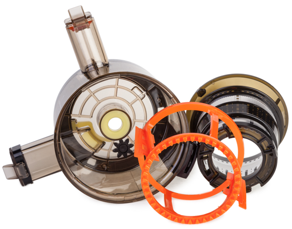 Резиновые пробки клапанов для выхода сока и жмыха, равно как и вращающаяся щетка окрашены в ярко розовый цвет. Такая расцветка не только симпатично выглядит, но также делает незаметным окрашивание этих элементов морковным соком. Весьма разумное решение.