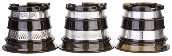 - саму соковыжималку (к нам на тестирование она поступила с тремя насадками — с мелкими и крупными отверстиями, а также с насадкой для сорбета);