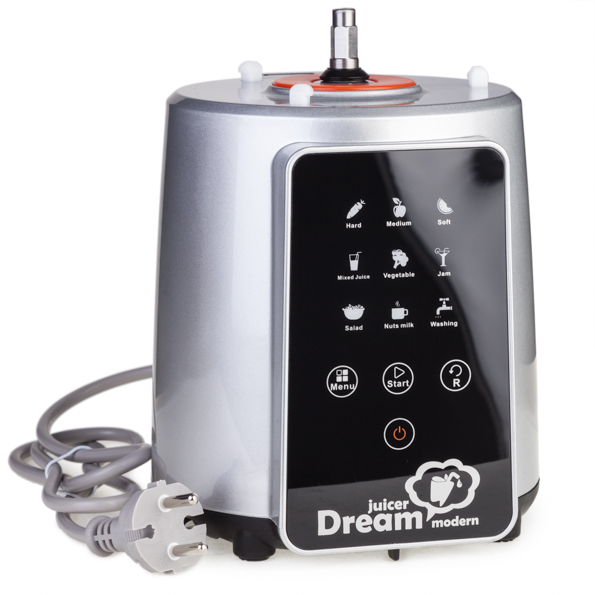 Визуальное знакомство с соковыжималкой оставляет исключительно приятные впечатления: основной (моторный) блок выполнен из пластика, выкрашенного «под металл». С фронтальной стороны находится блок управления с сенсорными кнопками, снизу — прорезиненные ножки и вентилятор охлаждения, сверху — разъемы для крепления съемных элементов.