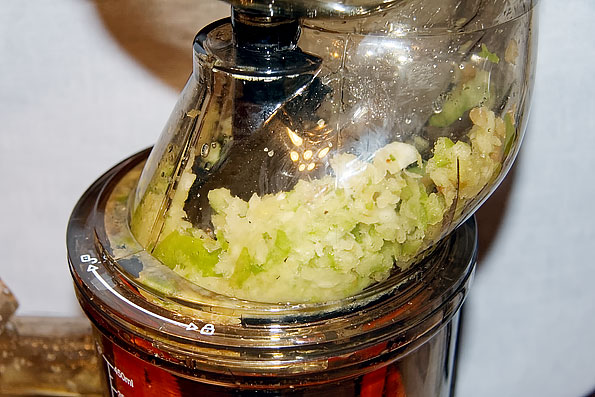 В качестве дополнительного теста мы выжали сок из стеблей сельдерея, пучка зелени и головки целого чеснока. Целью данного теста было выяснить, насколько хорошо соковыжималка справится с волокнистыми ингредиентами.