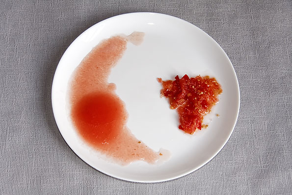 Еще одна насадка — крупная сетка, предназначенная для отжима сока с повышенным содержанием мякоти. Мы взяли обычный томат и выдавили его через такую сетку. Увы, густого томатного сока у нас не получилось. На фото видно, что бо́льшая часть томата отправилась в «отходы» (справа), а сок оказался полупрозрачным (слева). Вряд ли такой результат можно назвать «соком с мякотью».