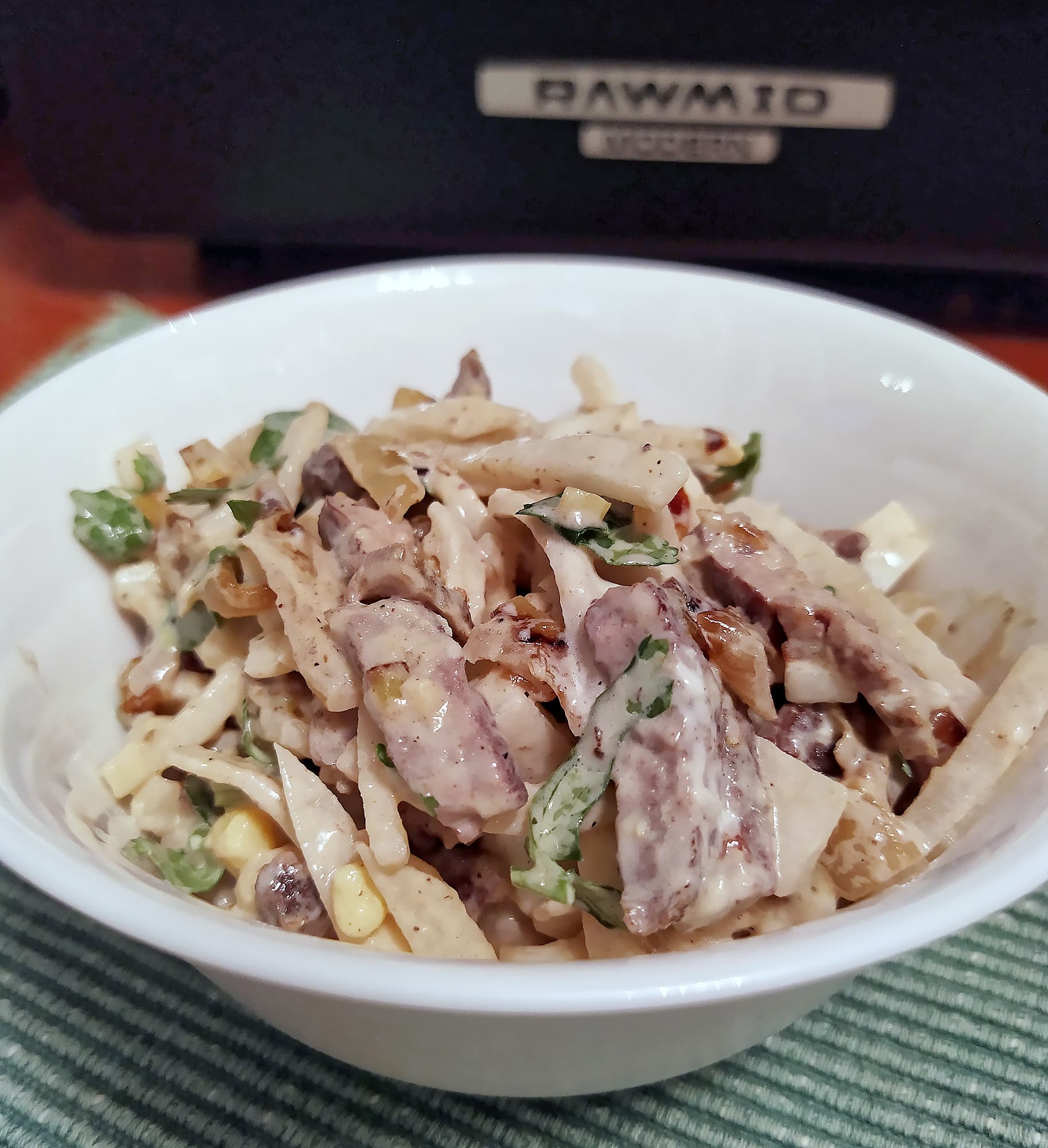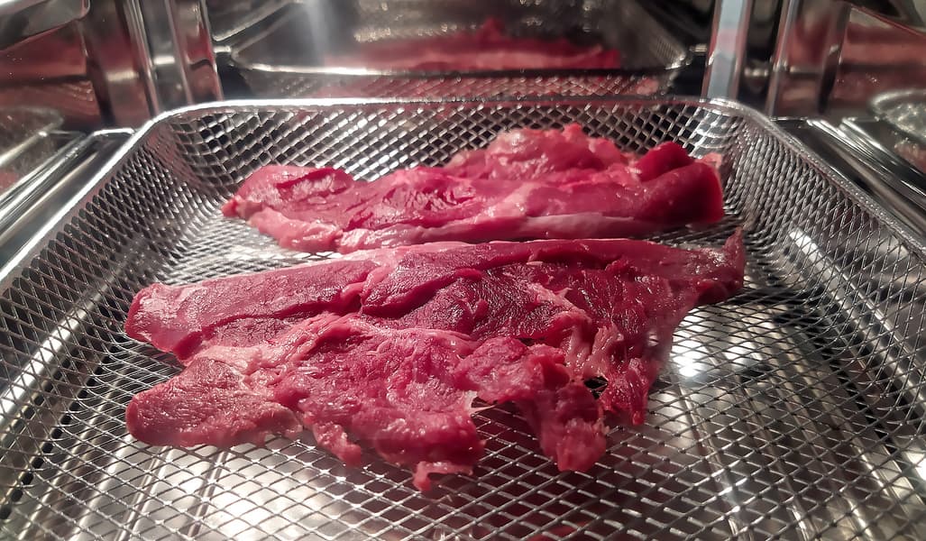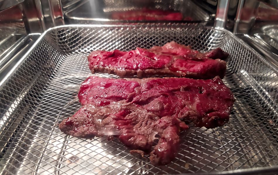 Рибай мы доели и пошли скрести по сусекам, где и обнаружили залежавшийся без дела «Стейк классик» — мясо российского производителя неизвестного нам происхождения и даже отруба. Решили сделать с ним салат «Ташкент», но говядину не варить, а приготовить в RMA-02. При извлечении из упаковки «стейки» отказались тончайшими кусочками мяса, так что мы просто положили их в корзину и отправили в аэрофритюрницу, включенную в режиме «Говядина».