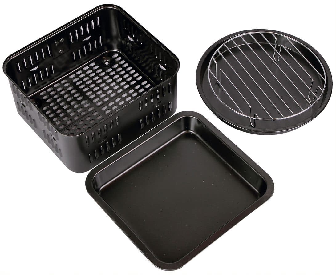 RMA-02 совсем небольшая. Габариты аксессуаров не располагают к масштабной готовке, а вот на одного-двух человек — в самый раз. В корзину отлично ложится килограммовая курица, а на решетке тики в тики помещается стандартная замороженная пицца. Как мы уже писали, такая аэрофритюрница выполняет функции и духовки, и микроволновки, и аэрогриля, так что это отличный способ сэкономить место на небольшой кухне, заменив несколько устройств одним. Если разжиться дополнительными аксессуарами, то RMA-02 станет и электрошашлычницей, и тостером (и не только). Более того, конструкция прибора позволяет готовить сразу на нескольких уровнях. Наверх можно поставить корзину с овощами, а вниз — противень с мясом — полчаса, и обед готов.