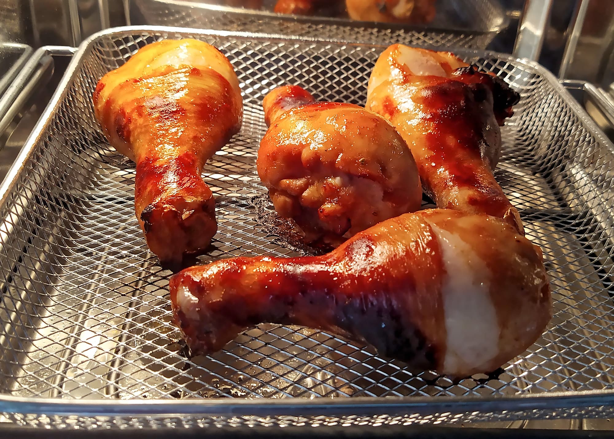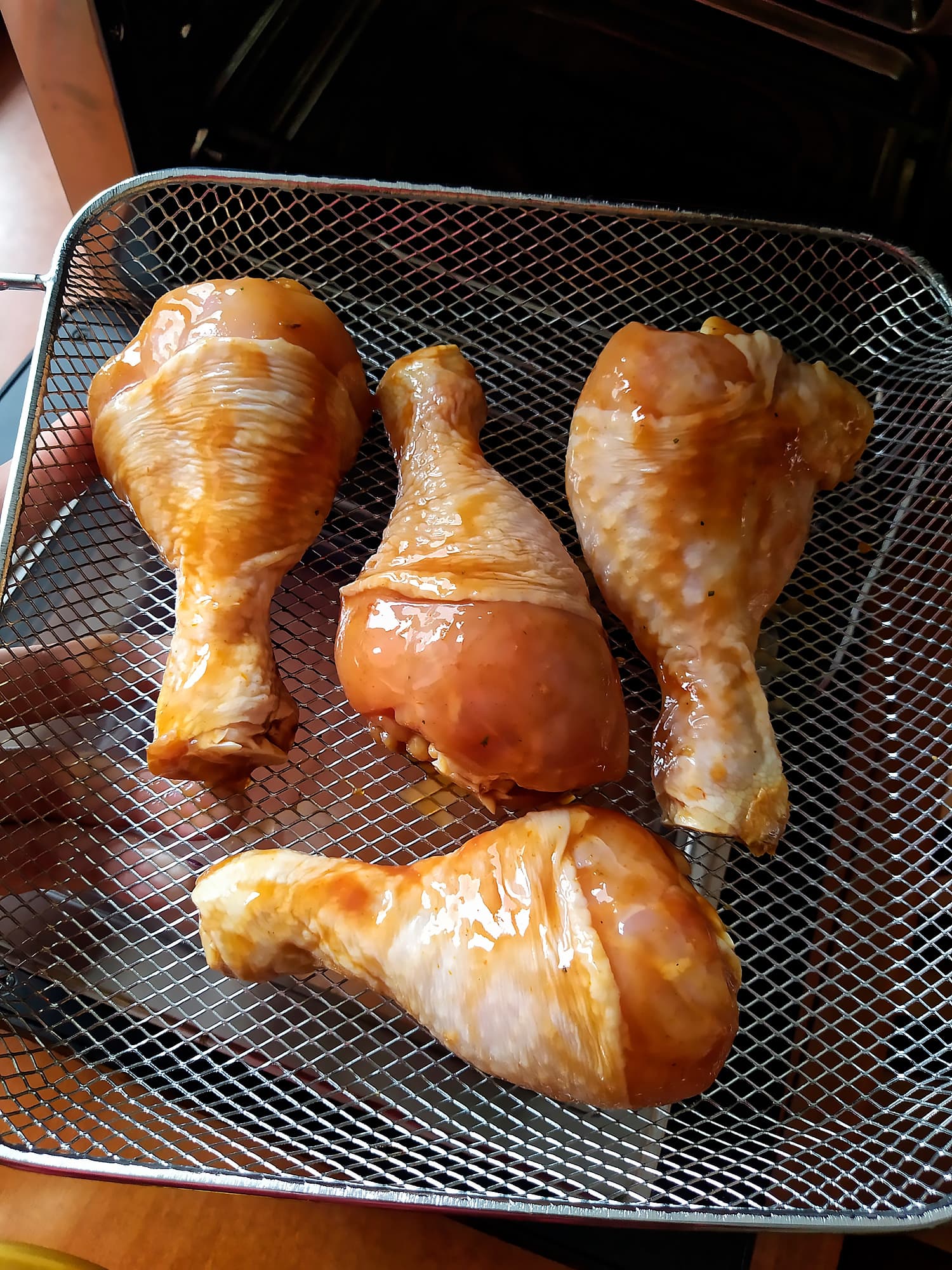 Чтобы прочувствовать прибор и приноровиться, мы начали с легкой артиллерии — голеней. Замариновали их в смеси устричного соуса, шрирачи, кетчупа и специй, затем выложили в корзину и отправили в RMA-02 в режиме «Крылья».
