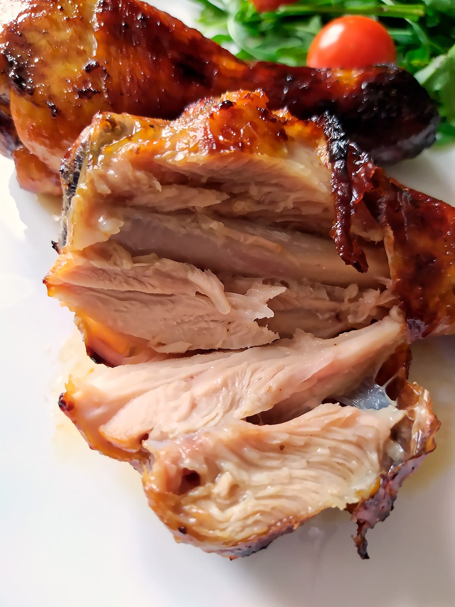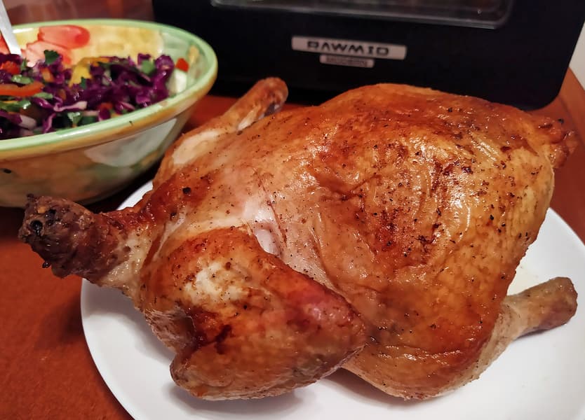 Вышло отлично: кожица поджарилась, но не подгорела, мясо полностью приготовилось, но осталось сочным. В целом, получилось то же самое, что и в корзине — грудка была влажнее спинки.
