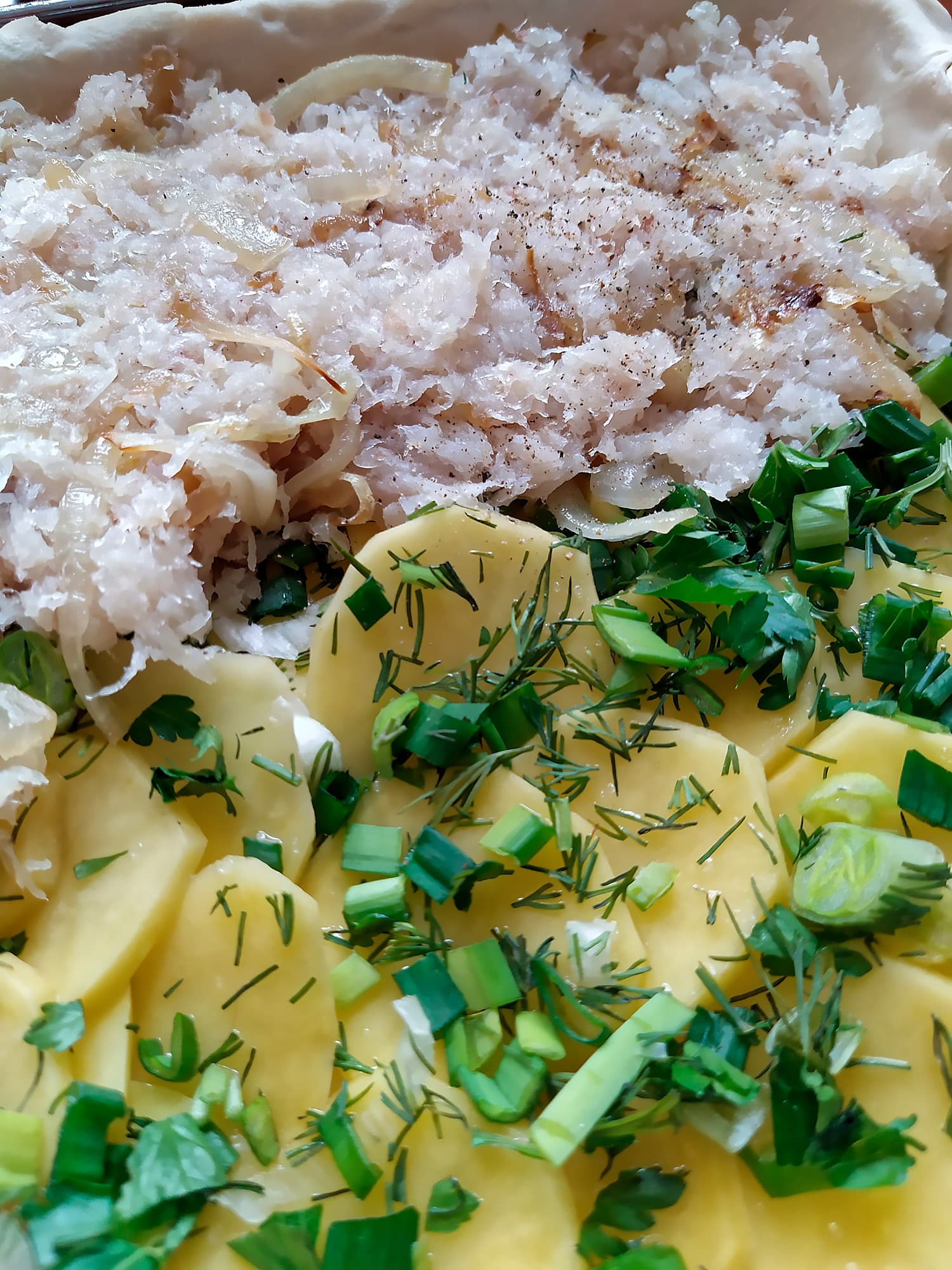 Печь решили прямо в корзине. Пласты бездрожжевого слоеного теста раскатали до нужного размера (надо отметить, что стандартный «квадрат» теста маловат, раскатывать нижний пласт пришлось довольно тонко), ровным слоем разложили картофель, нарезанный тонкими кружками, посолили и присыпали зеленью. Сверху уложили рыбный фарш, смешанный с жареным луком, солью и перцем.