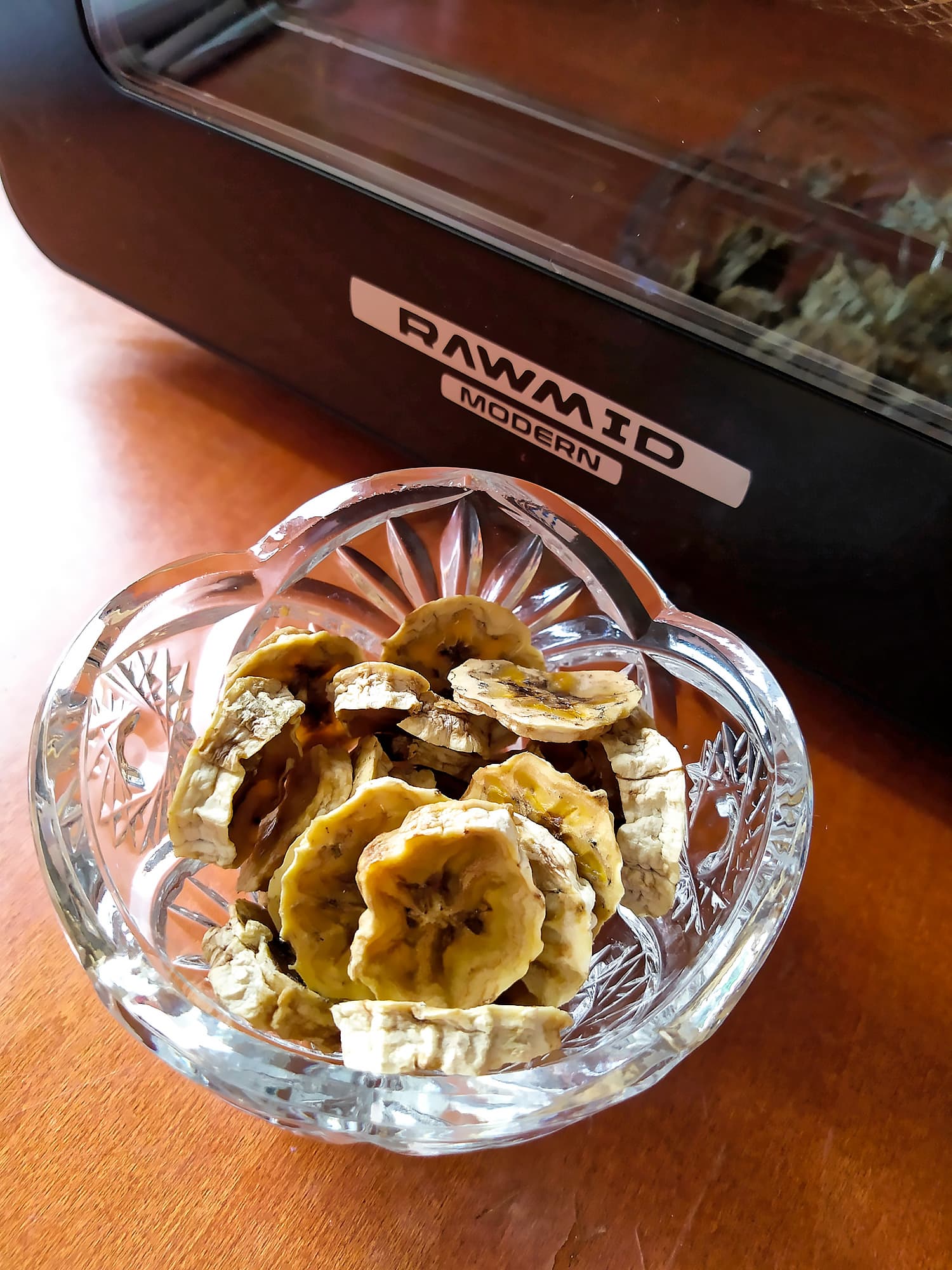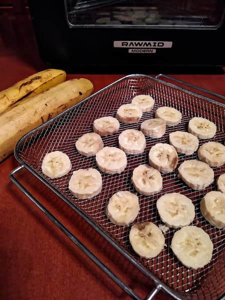 Раз уж RMA-02 умеет быть еще и дегидратором, решили приготовить свою любимую замену конфетам. Один банан нарезали кружками и разложили их в корзине. Температура — 70 °C, время — 8 часов.