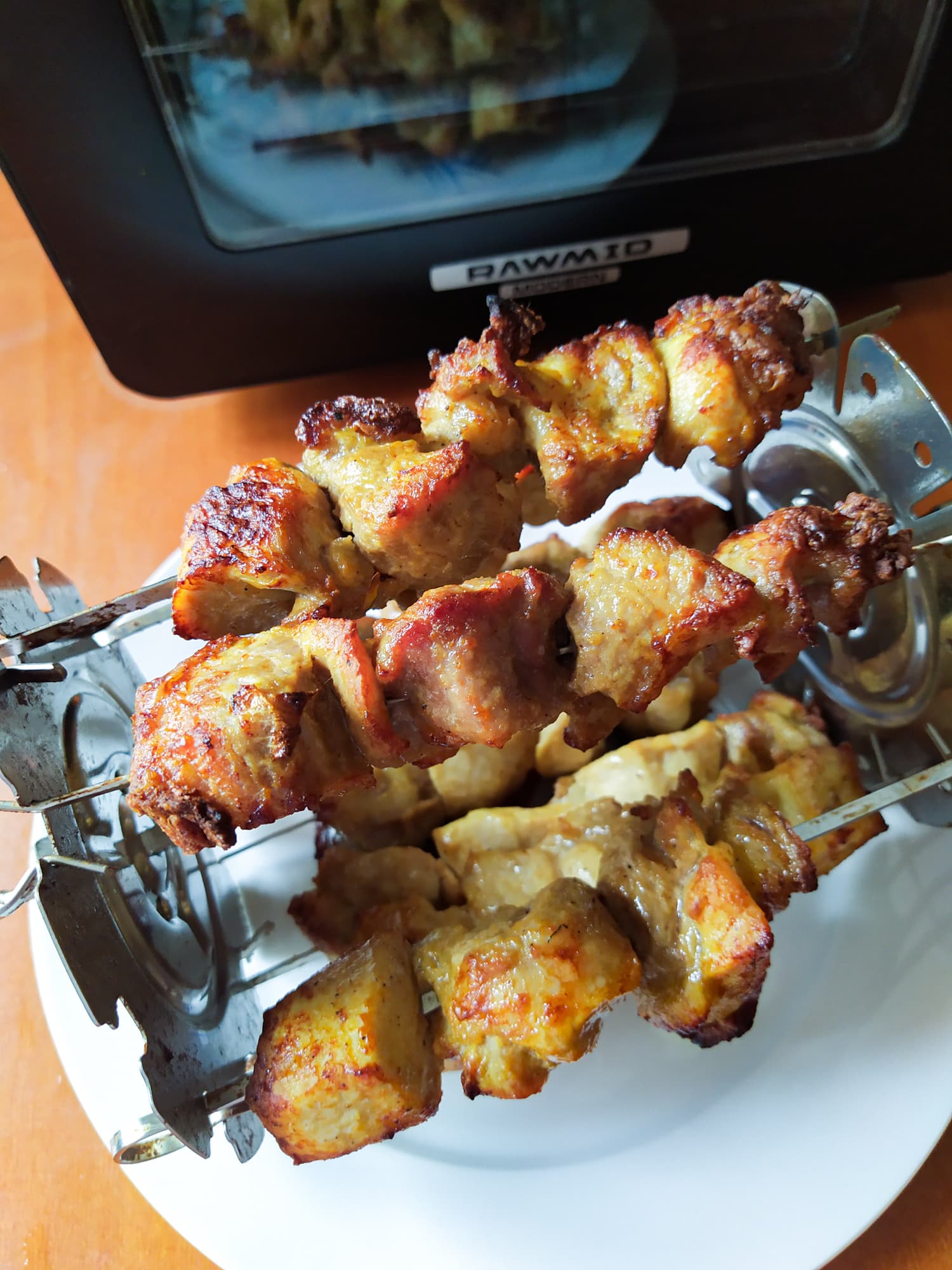 Через 8 минут на кусочках мяса наметилась поджаристая корочка. Через 15 наш шашлык уже шкворчал, а запах на кухне витал не хуже, чем у дачного мангала. Через 20 минут RMA-02 известил нас о том, что всё готово.