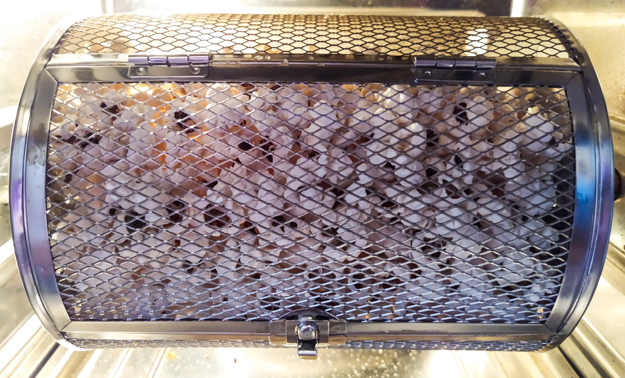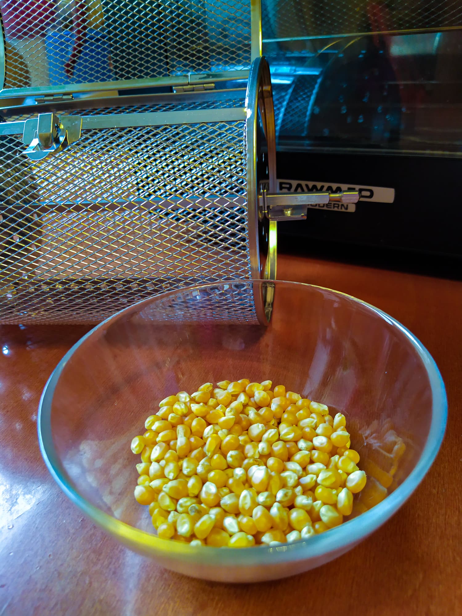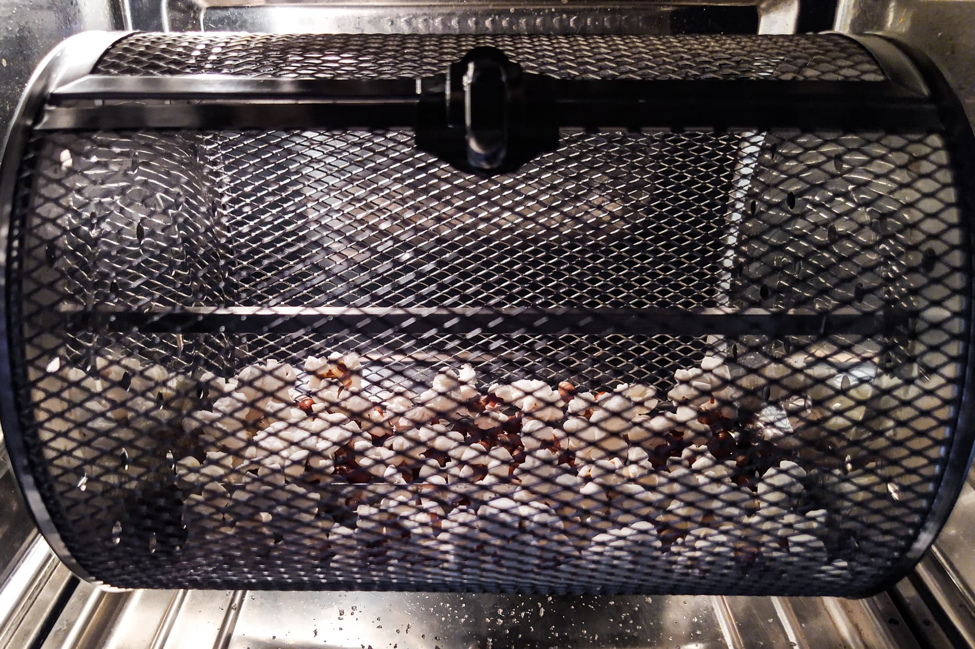 Установили корзину в RMA-02, поставили режим «Попкорн»: 220 °C, 12 минут. Первые 6 минут зерна перекатывались по корзине без какого-либо прогресса, и вдруг раздался первый «бах» — картина начала стремительно меняться, кукуруза стала взрываться.