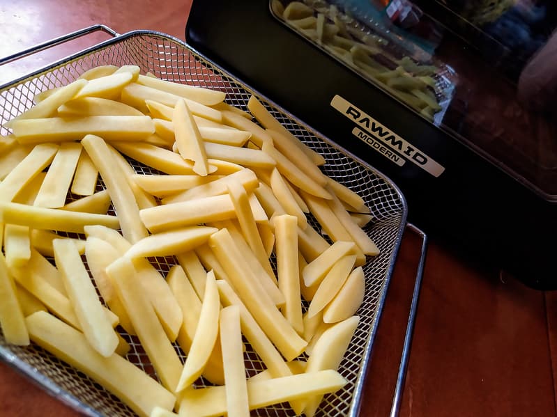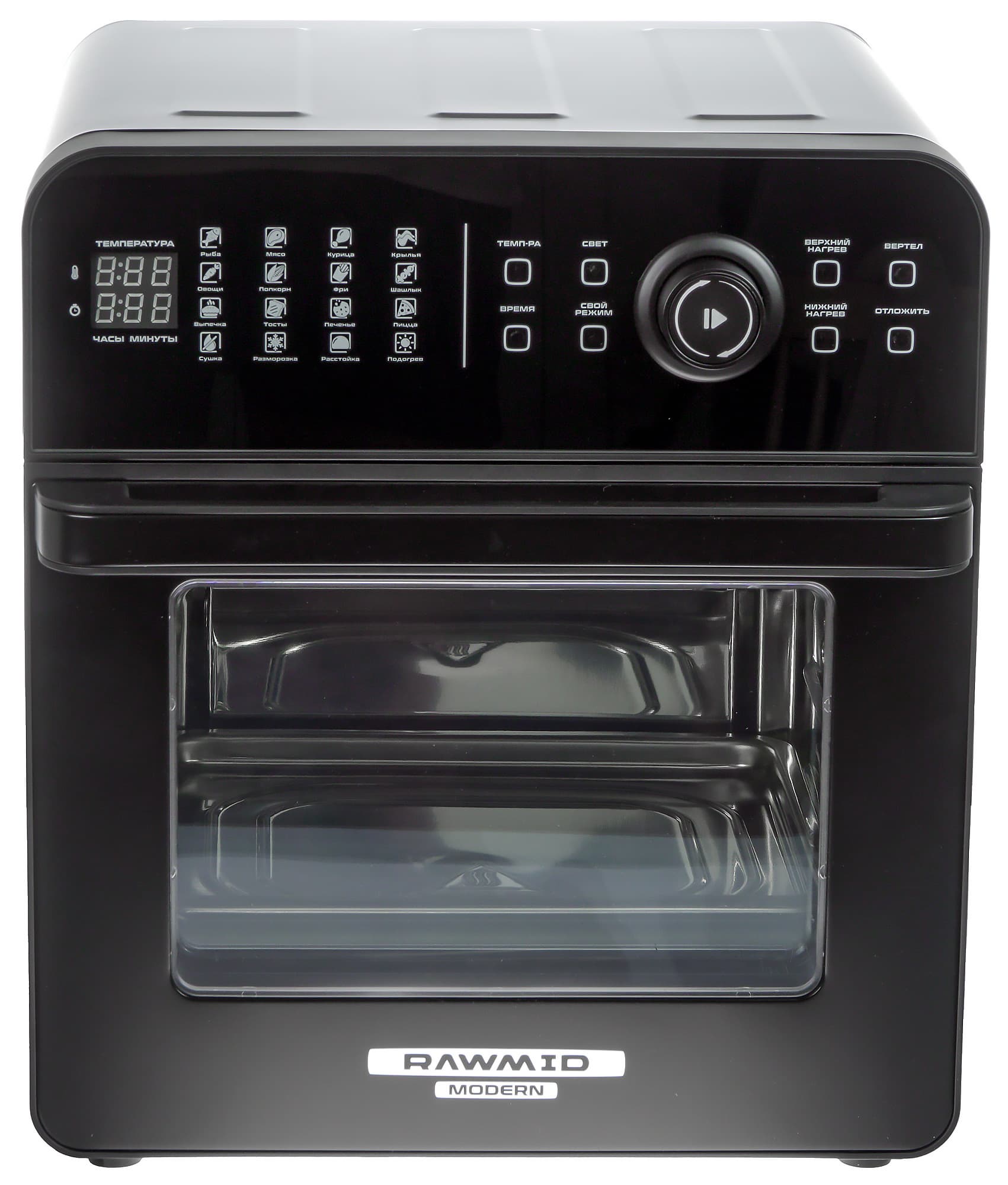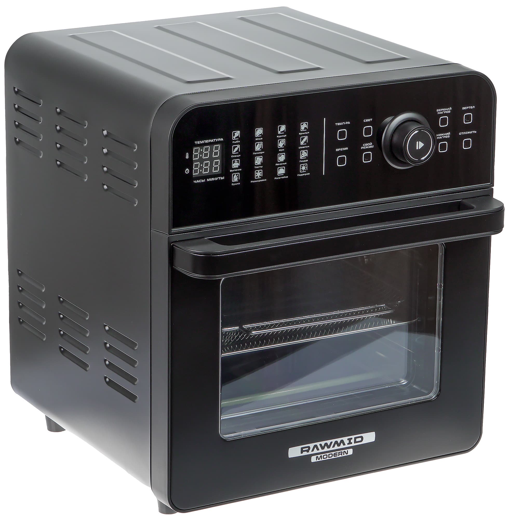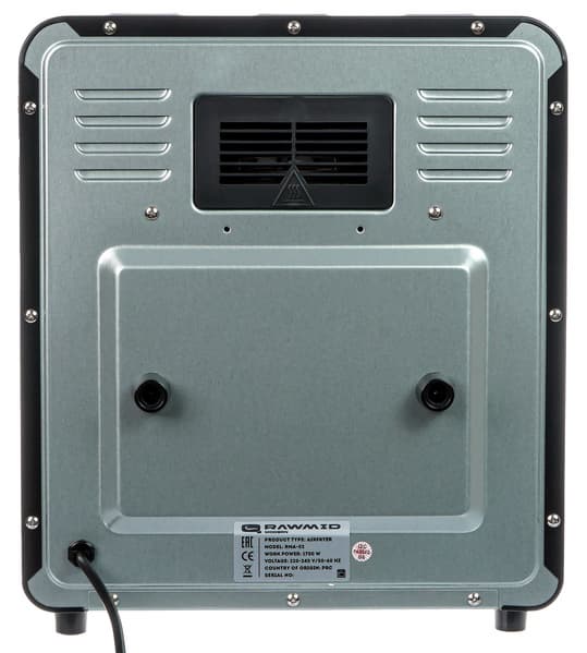 Аэрофритюрница — это прибор, в котором, несмотря на обманчивое название, термическая обработка продуктов происходит за счет циркулирующего воздуха, а минимальное количество масла при необходимости добавляется прямо в блюдо. К примеру, для приготовления картофеля-фри в таком устройстве вам понадобится всего пара чайных ложек масла. Rawmid Modern RMA-02 совмещает в себе аэрофритюрницу, аэрогриль, духовку и дегидратор. В некоторых источниках ее даже называют мультипечью.