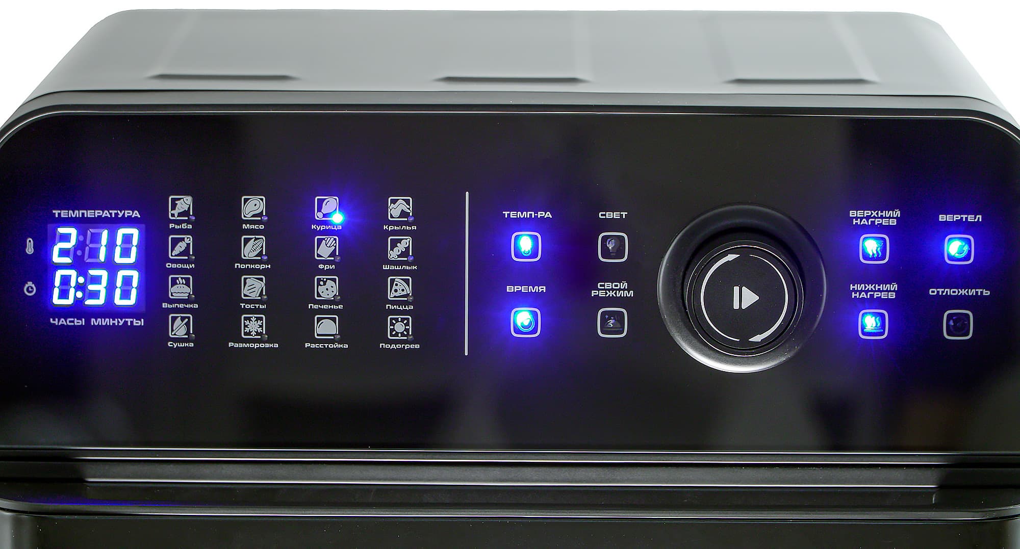 Учитывая, что в каждом режиме можно изменить и температуру, и время приготовления, заданные параметры можно воспринимать как ту самую подсказку, которой не хватало в инструкции. Понятно, что и курицы бывают разные, и овощи овощам рознь, но здесь хоть какие-то ориентиры. Вот только 180 °C для пиццы смущают: обычно это блюдо требует куда более высокой температуры.