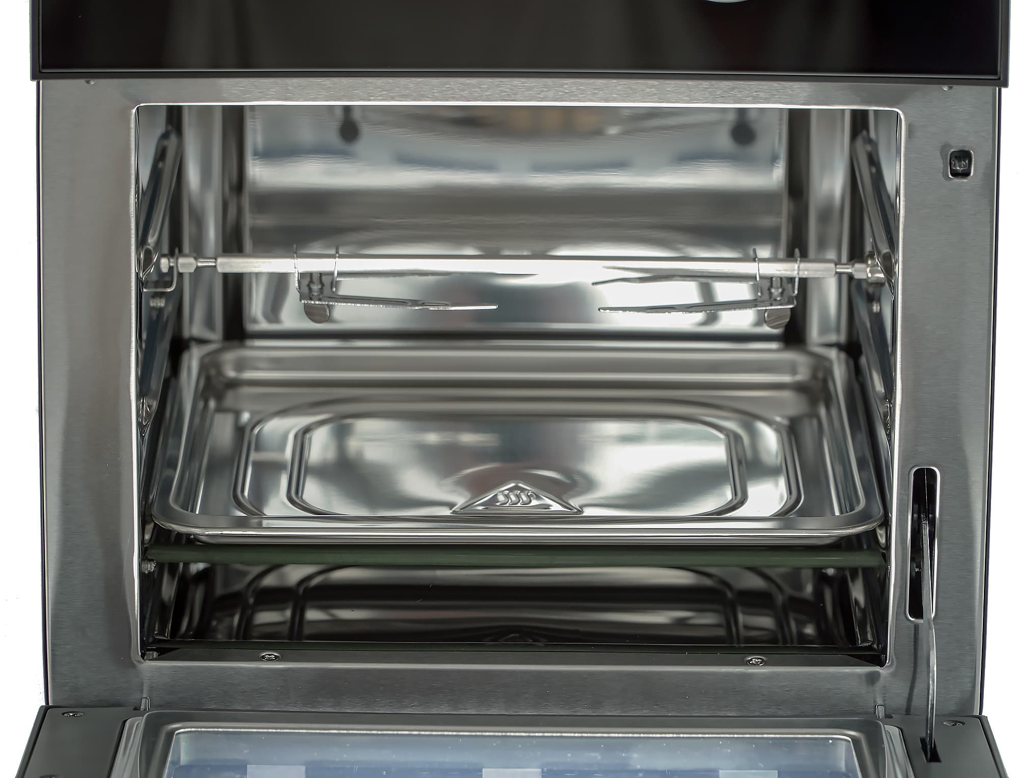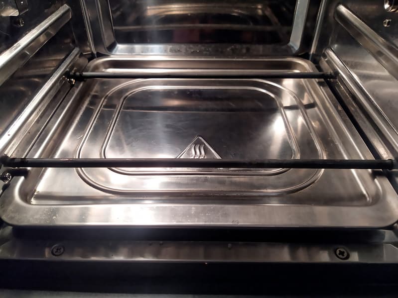Еще два тэна-жердочки — внизу. Под них устанавливается поддон, в который будет стекать жир или падать крошки. Его при необходимости можно использовать и как противень.