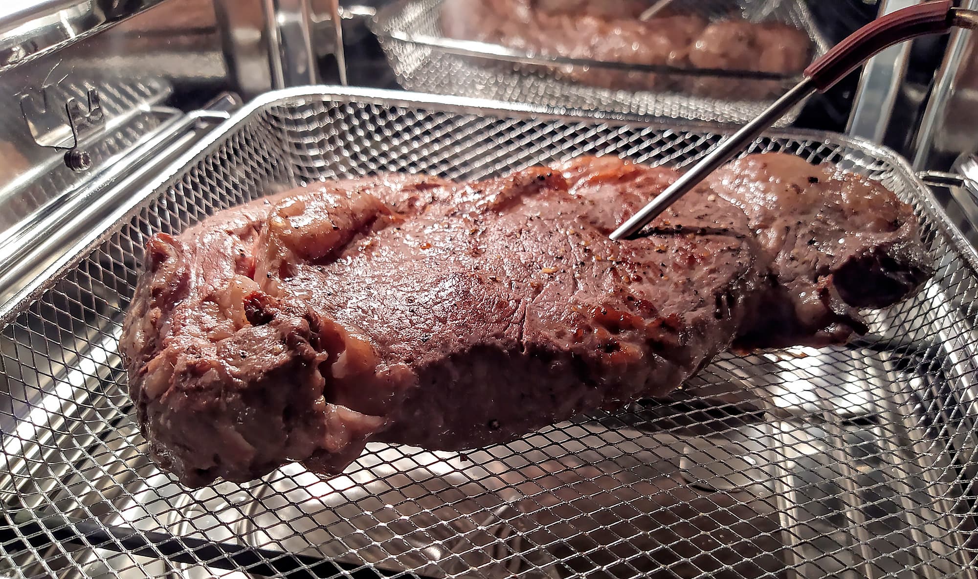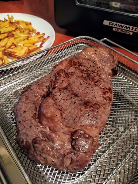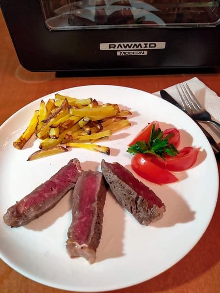 В нашем распоряжении оказался отличный рибай граммов эдак на 250, и мы решили совместить приятное с полезным: и прибор протестировать, и вкусно поесть. Однако мы все-таки подстраховались и предварительно «запечатали» мясо на очень горячей сковороде, а затем отправили в RMA-02 на 5 минут при температуре 200 °C.