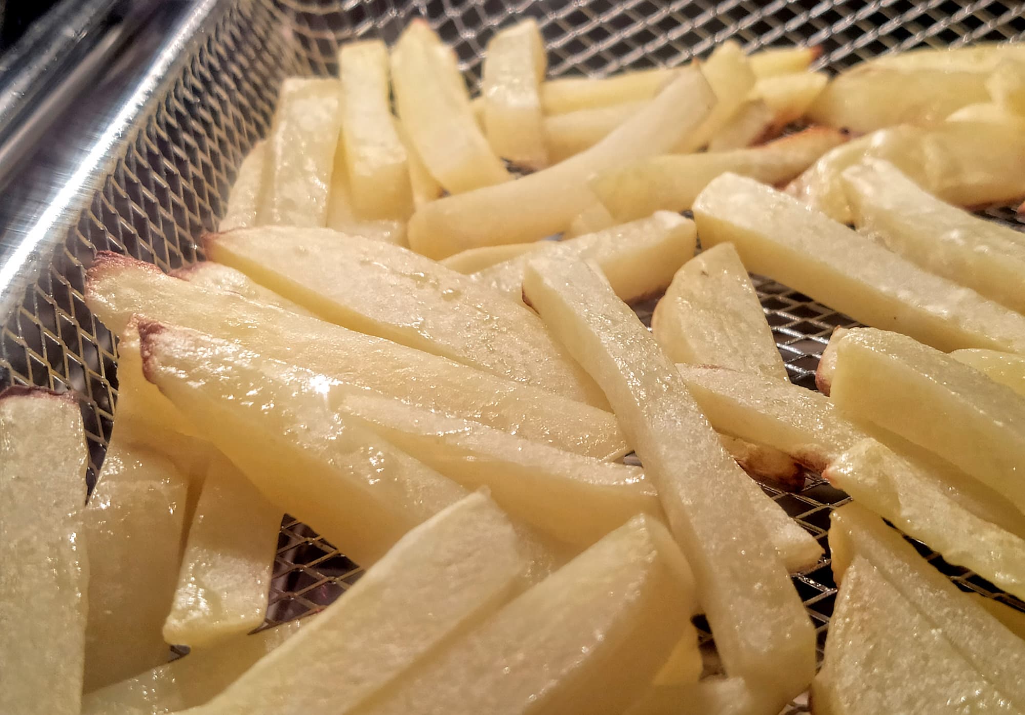 Через 7 минут кончики брусков подернулись золотистой корочкой. Мы решили поворошить содержимое корзины, и оказалось, что снизу картошка поджарилась сильнее, чем сверху.
