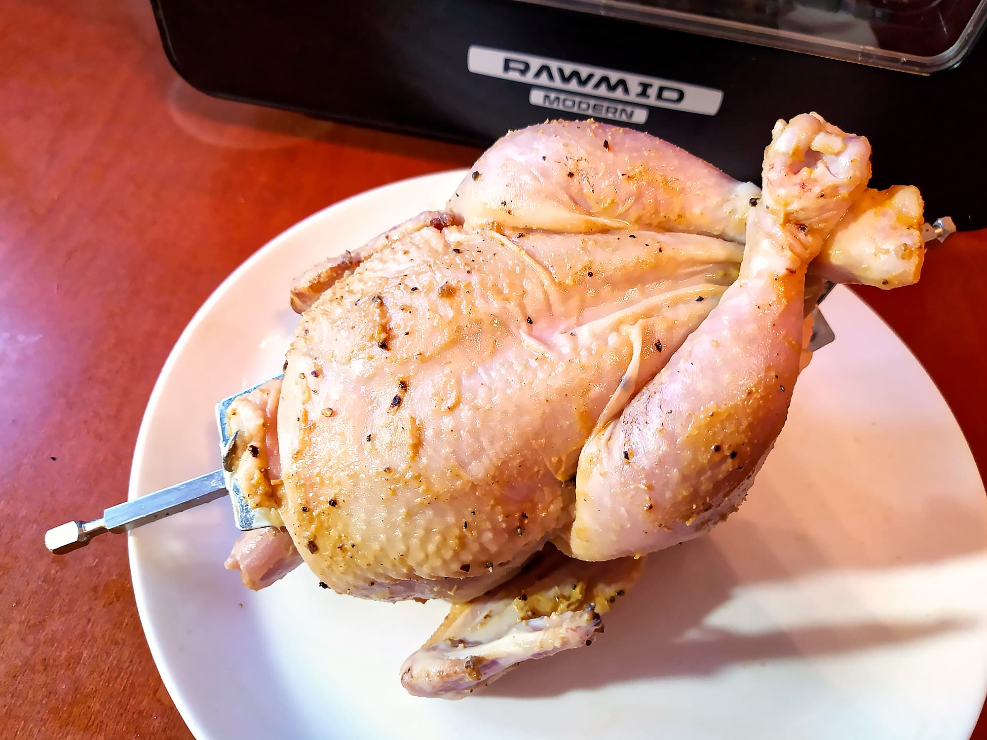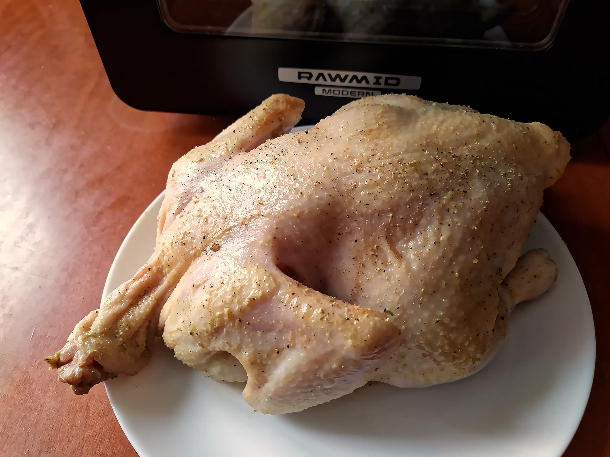 Вообще-то мы рассчитывали сразу перейти к курице на вертеле, но птичка, которая на прилавке казалась совсем крохотной, для этого теста не подошла: на вертел стоит насаживать курицу весом не больше 900 граммов, а наша перевалила за килограмм. Что ж, мы не растерялись, замариновали этого переростка в горчице и смеси специй, посадили в корзину и отправили в RMA-02 в режиме «Курица».