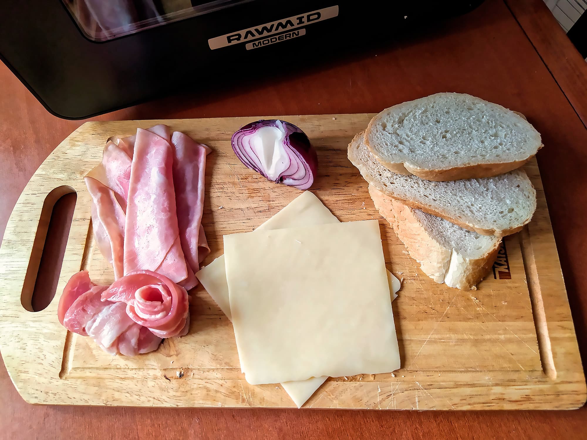Мы включили RMA-02 в режиме «Тосты», и пока хлеб подсушивался на решетке, быстро порезали бекон, лук и пару шампиньонов. Подсушенный хлеб смазали томатным соусом, положили луково-беконно-грибную смесь, накрыли ветчиной и сыром и отправили все это дело обратно в печь в том же режиме.