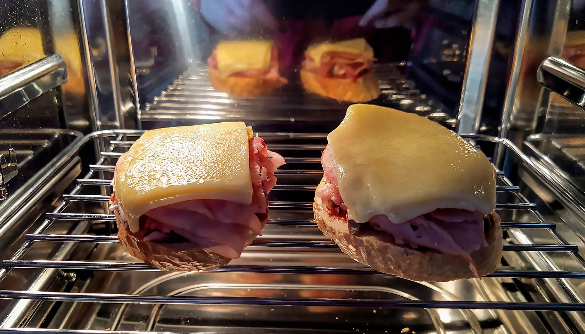 Через 5 минут сыр начал аппетитно поджариваться, но при этом стал стекать с бутербродов, так что мы спешно извлекли их. За это время лук и грибы стали мягкими, бекон припекся — получилось очень вкусно. Если умудриться положить сыр по центру, чтобы он не успел «убежать», можно получить и поджаристую корочку.