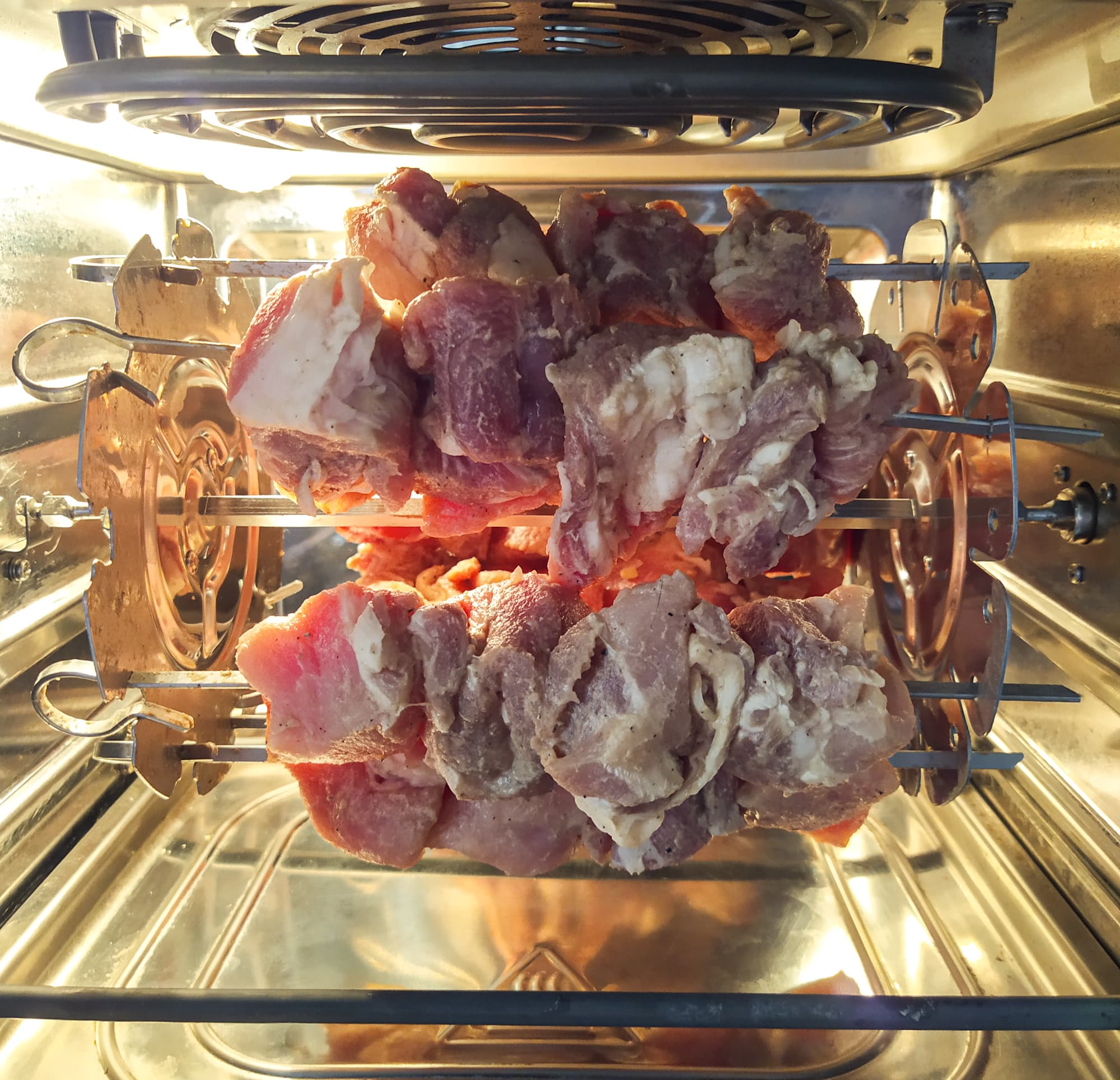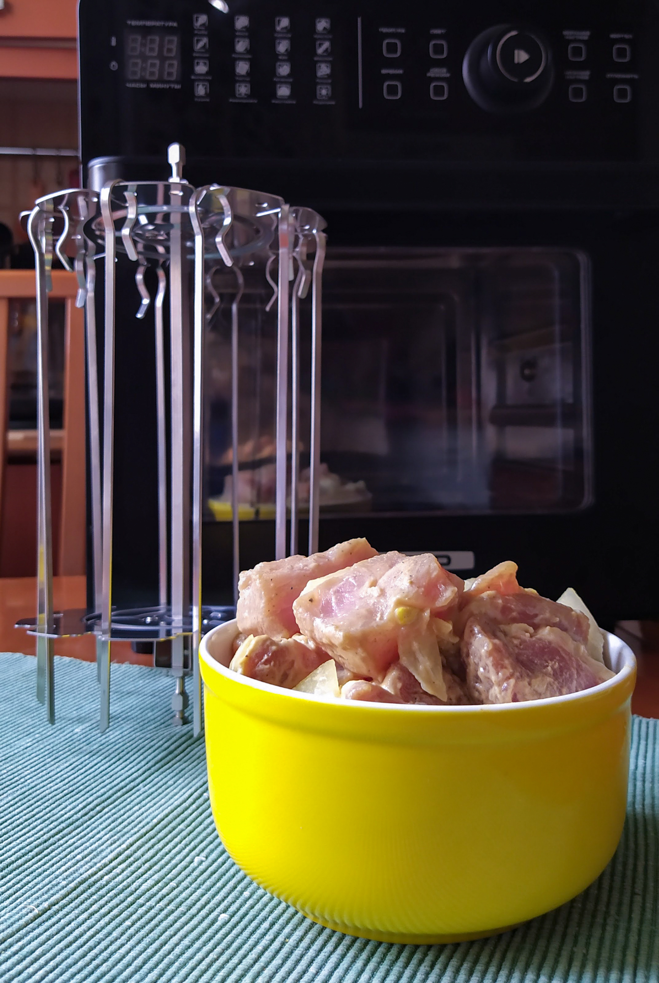 Вращающийся держатель для шампуров не оставил нам выбора: быть шашлыкам. Чуть меньше килограмма свинины замариновали с луком и горчицей.