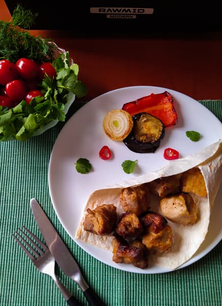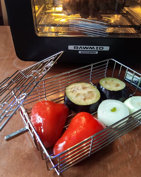 Выглядел шашлык замечательно. Не удержались, попробовали кусочек: сочное мясо с хрустящей корочкой. Сняли шампуры с держателя и накрыли их фольгой. Когда мясо еще крутилось в RMA-02, мы подготовили овощи: кусочки перца, лука и баклажана смазали оливковым маслом и уложили во вращающуюся решетку.