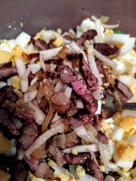 Мы оставили его в распоряжении печи и занялись подготовкой остальных ингредиентов салата. Лук был поджарен заранее, яйца отварены — осталось их порубить, а редьку нарезать маленькими брусочками. Это заняло 10 минут, за это время и «стейки» подошли. Визуально мясо выглядело как жареное, хотя мы не смазывали его маслом.