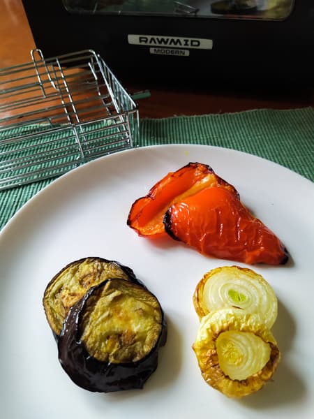 Опять же с помощью цанги установили ее в аэрофритюрницу. Режим «Овощи», 200 градусов, 15 минут. Когда пропищал таймер, мы вынули решетку, аккуратно открыли ее и достали овощи. Баклажаны полностью пропеклись, лук зазолотился, а на перце появились аппетитные подпалины.