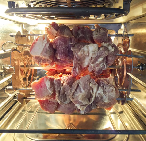Нанизали мясо на шампуры, закрепили их в держателе и установили в RMA-02 с помощью цанги. Режим «Шашлык», 200 °C. Прибор задал 15 минут, но мы ему не поверили и поставили 20.