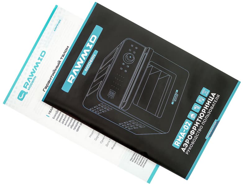 Modern RMA-02 прибыла в нашу лабораторию в «верхней одежде»: под транспортировочной коробкой с перечисленными на ней техническими данными пряталась коробка красочная с красивым фото прибора и блюд, которые можно в нем приготовить. Еще не вскрыв упаковку и не добравшись до аэрофритюрницы и инструкции к ней, можно многое узнать о приборе: на гранях коробки хватает информации о его характеристиках и плюсах.