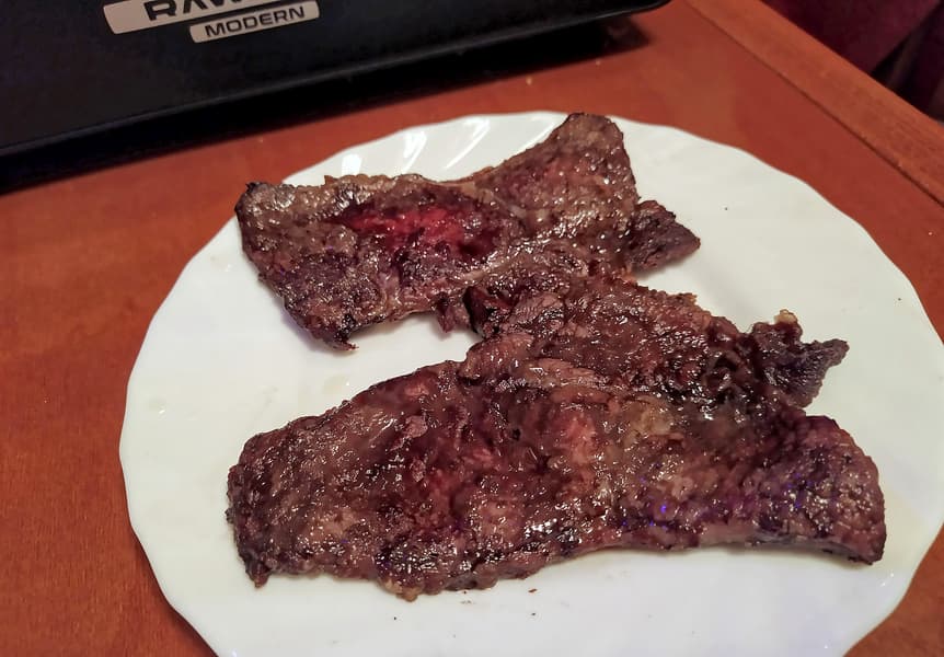Через 4 минуты мясо было полуготово: снизу уже поджарилось, а сверху было сырым.