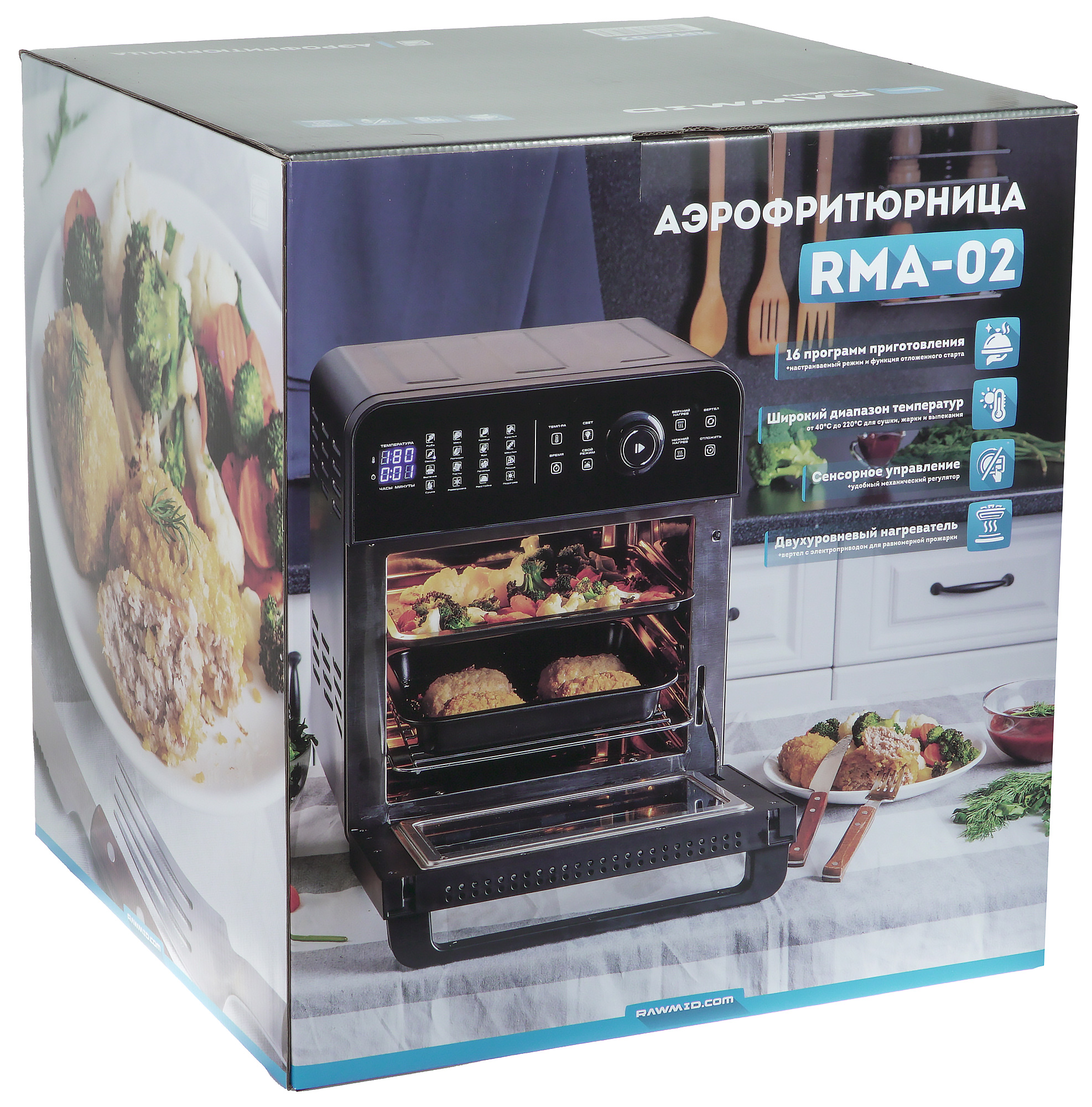 Правильно в интернете называют RMA-02 мультипечью: аэрофритюрница — лишь одна из ее ипостасей. Приготовить картофель-фри, курицу-гриль или пожарить мясо — все это прибору по силам, еще и без лишнего масла. Испечь пирог — тоже запросто. Завялить фрукты или посушить грибы — и с этим можно обратиться к RMA-02. Но разогревается прибор, в отличие от обычной духовки, почти мгновенно, так что и время приготовления ужина сокращается.