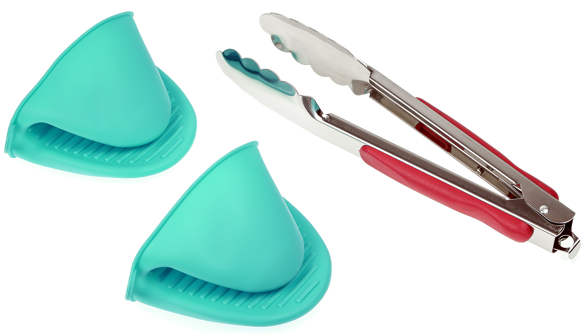 Помимо этого обнаружился бумажный пакет с подарками от Rawmid: голубыми силиконовыми прихватками и щипцами.