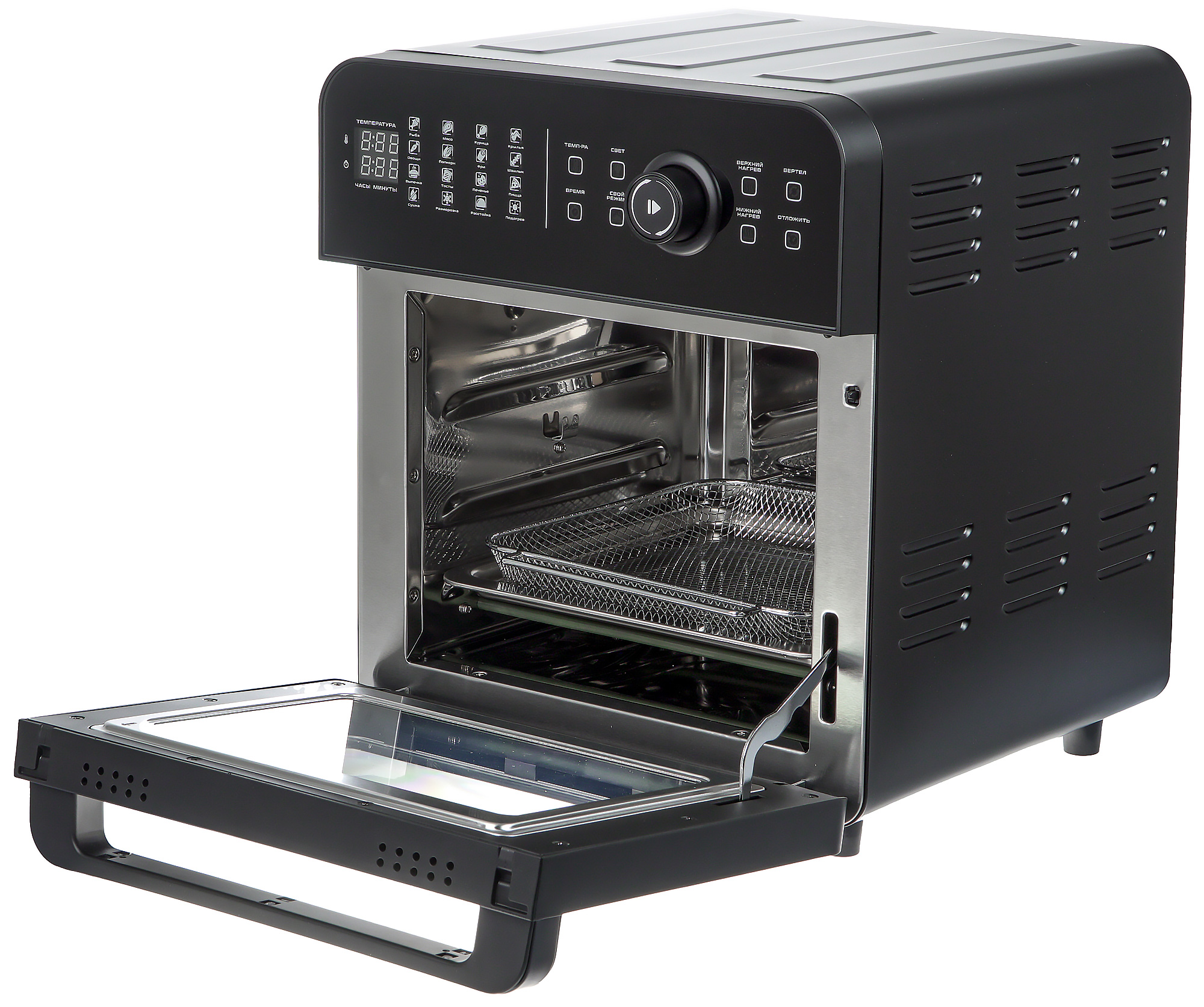 Снаружи аэрофритюрница выглядит достойно: все элементы отлично подогнаны, дверца легко открывается и устойчиво держится в приоткрытом положении, панель управления удобная и интуитивно понятная. Заглянем теперь внутрь.