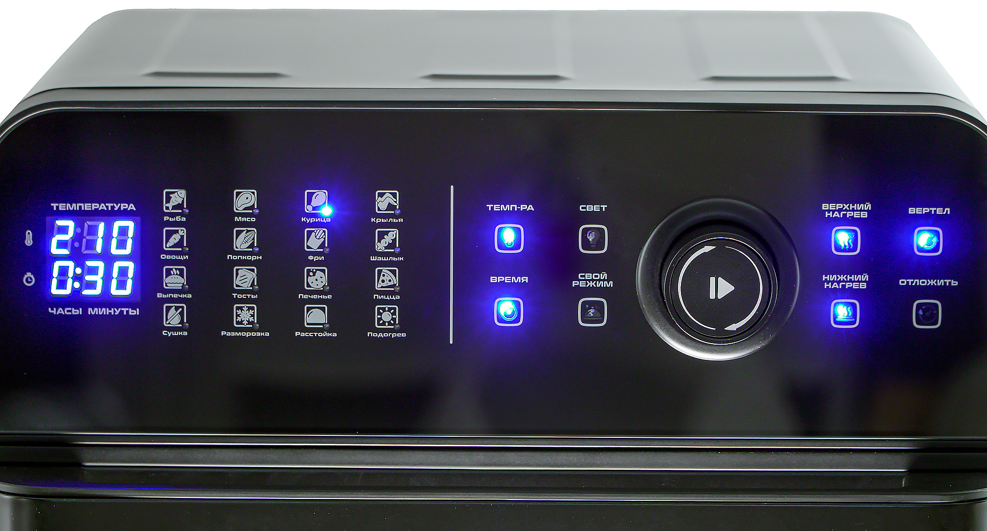 Панель управления выглядит полностью сенсорной, а механический переключатель-ручка как будто случайно сюда затесался. На самом деле вся левая часть — просто индикаторы. А вот справа и правда расположились сенсорные кнопки.