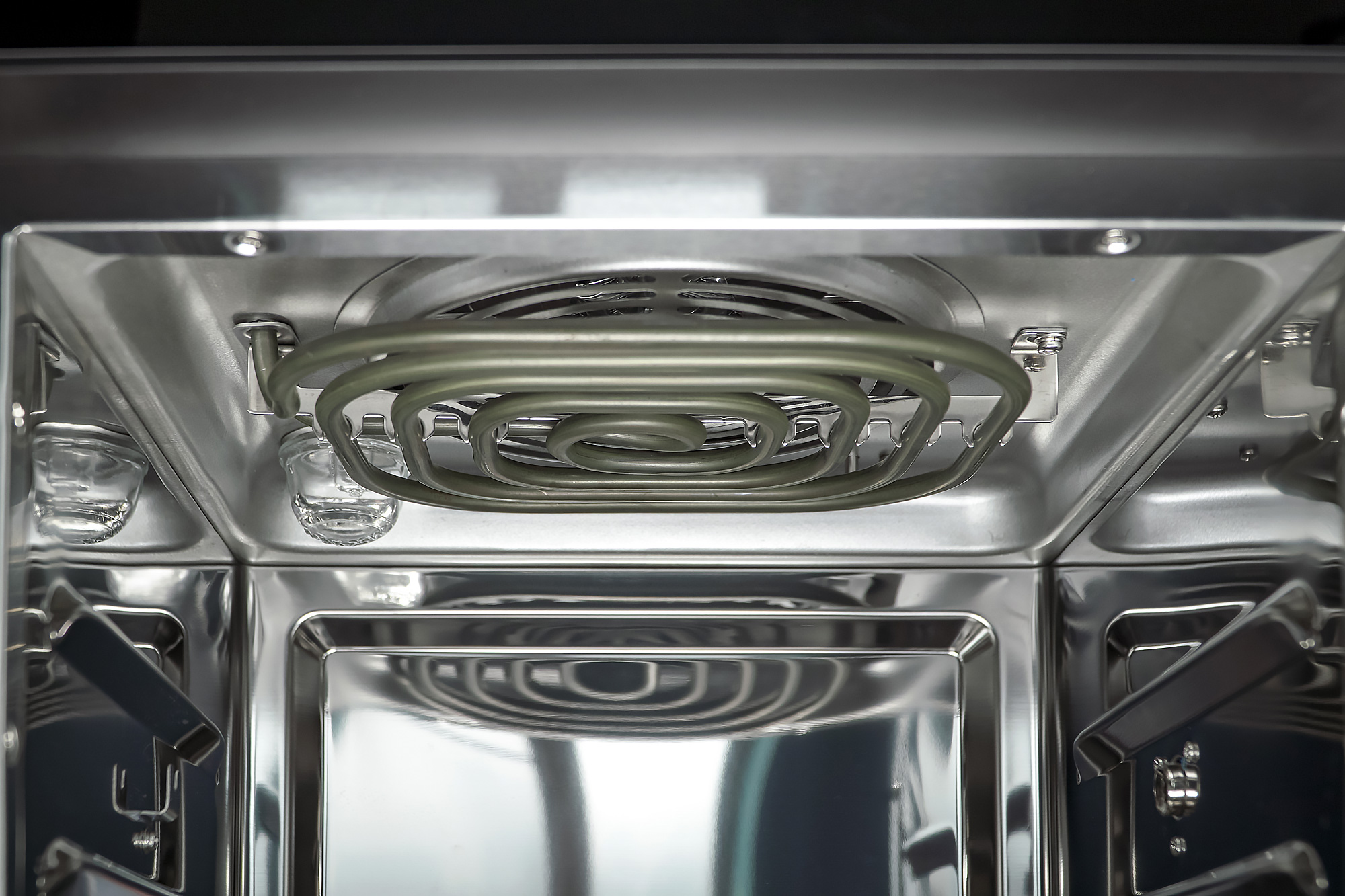 А внутри нас ждет... духовка. Только очень маленькая и с открытыми тэнами. Один, спиралевидный, сверху. Над ним спрятан вентилятор, который и будет разгонять горячий воздух по камере. В дальнем левом углу — лампочка.