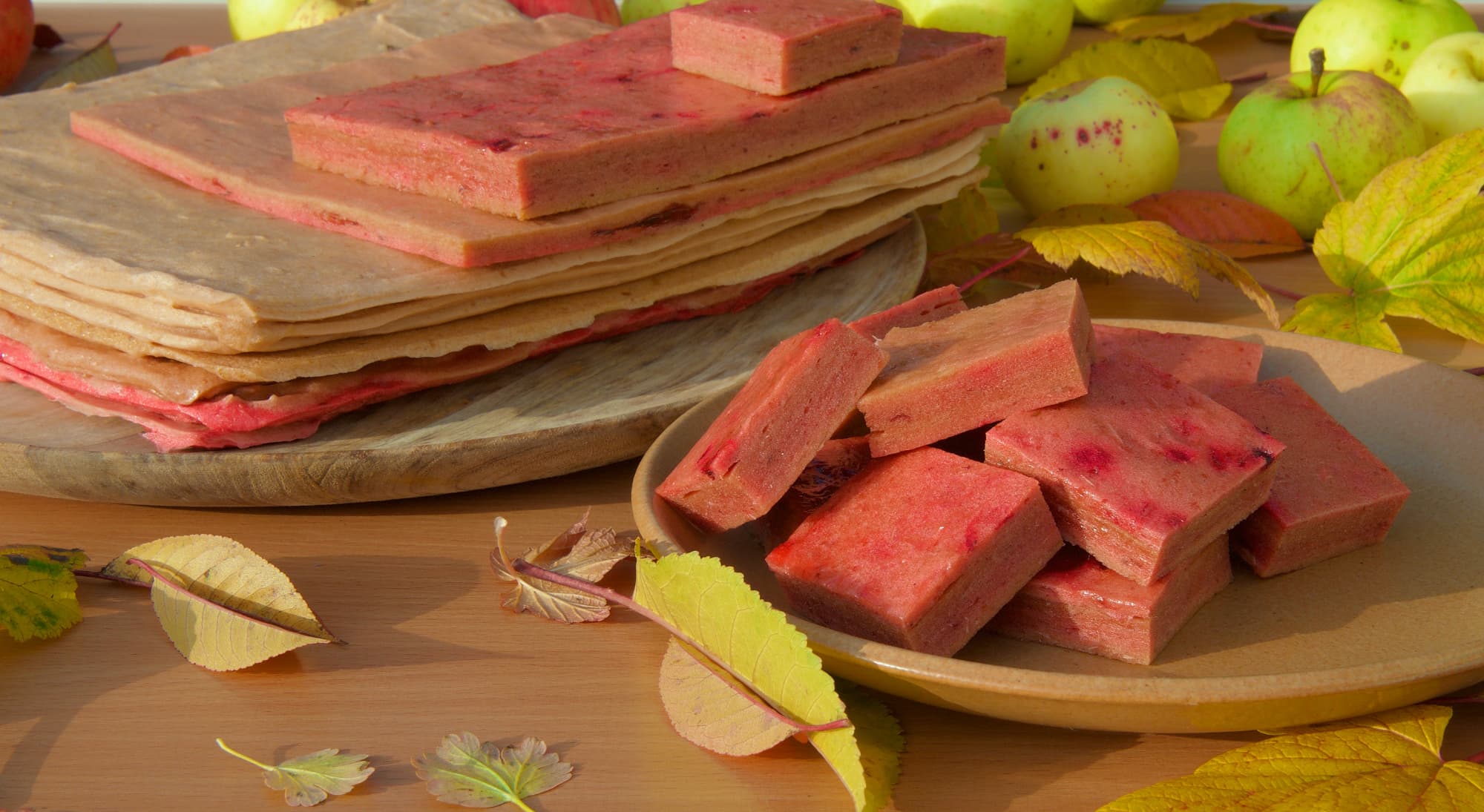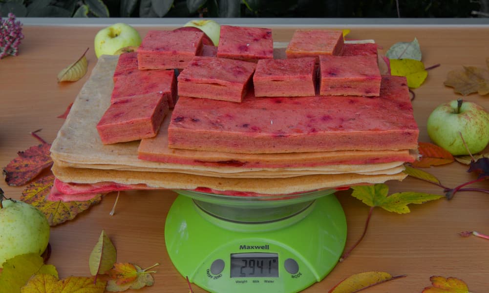 Массу мы выложили на лотки для пастилы, равномерно распределяя слой около 7-8 мм (на некоторых — до 10 мм). Выставили 50 °C на 20 часов. Периодически, раз в час, смотрели за готовностью пастилы. Как только верхний слой подсыхал, мы намазывали на него следующий, в 5-7 мм, и опять ставили в дегидратор. Иногда мы меняли лотки местами. Когда слой пастилы был более 2,5 см, приходилось убирать лоток над ним. Некоторые пласты пастилы мы клали друг на друга, склеивая между собой слоем пюре, так освобождались лотки для следующих пластов. После 12-14 часов мы выложили пласты верхней стороной на сетчатые поддоны, убрав поддоны с бортиками, и продолжали наращивать пастилу сверху новыми порциями пюре. В результате за 24 часа в дегидраторе у нас получилось около трех килограммов пастилы в пластах разной толщины. Для лучшего вида осталось только срезать неровные края и нарезать продукт на кусочки.