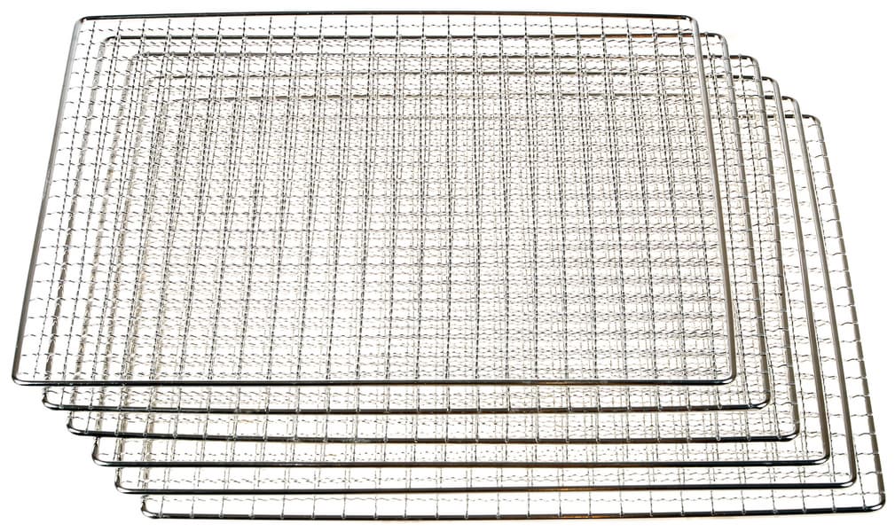 Аксессуары нам понравились. Основные лотки сделаны из нержавеющей стали, они прочные и удобные. Особенно хочется отметить, что поверхность — из волнистой проволоки. Таким образом, соприкосновение с продуктом будет небольшим, следовательно, минимизированы риски прилипания и приставания. Так как проволока из нержавейки, а не стальная никелированная, продукт можно при необходимости резать прямо на лотке — например, подравнивать края пастилы, не боясь испортить лоток.