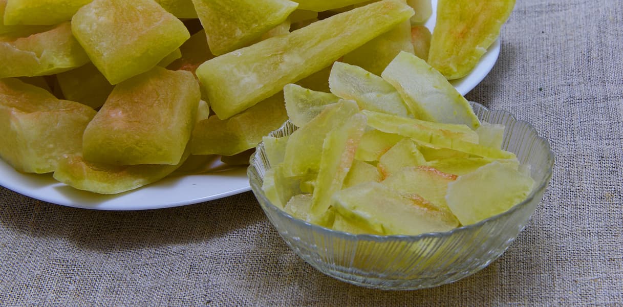 Процесс засахаривания занял 5 дней. После того, как корки стали полностью прозрачными, мы вымыли их в холодной воде и высушили при 60 °C в течение 10 часов. Такое время связано с большой толщиной арбузной корки в нашем случае. Готовые изделия завакуумировали. Перед подачей остается только достать из пакета нужное количество и нарезать тонкими дольками.