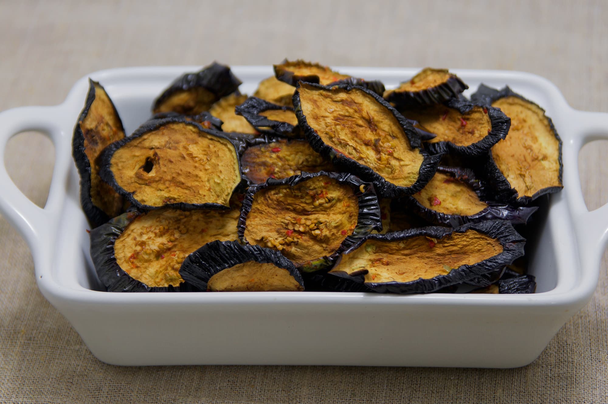 Баклажаны нарезали кружочками толщиной от 1 до 1,5 см и замариновали в течение нескольких часов в соевом соусе с добавлением измельченного чеснока, перца, оливкового масла, вустерширского соуса и сахара. Затем вынули, удалили лишнюю влагу полотенцем и отправили на лотки в дегидратор.