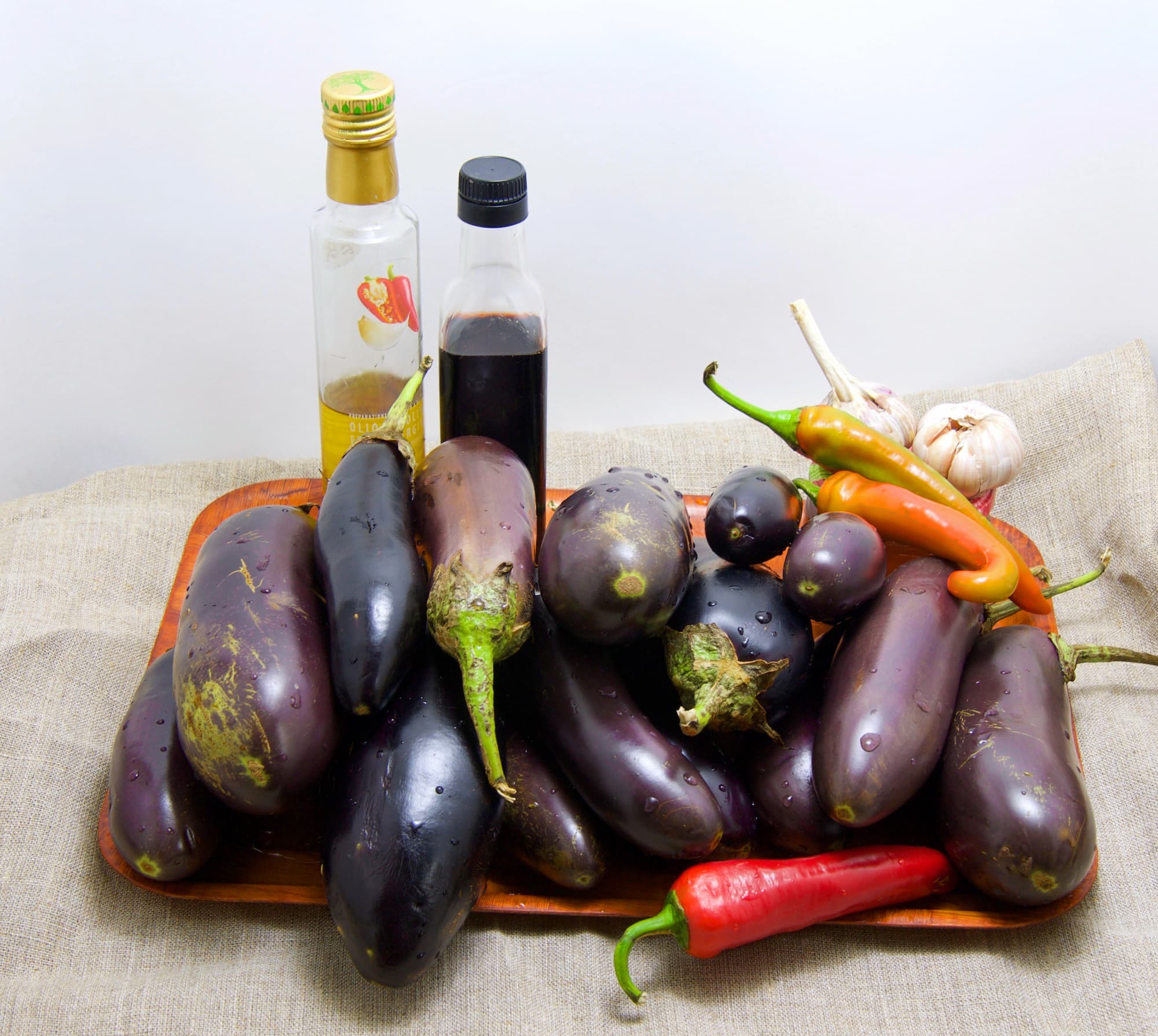 Мы использовали рецепт из приложенной к дегидратору книги рецептов Rawmid. Для приготовления пряных сушеных баклажанов понадобились: пара килограммов свежих баклажанов, свежий острый перец, оливковое масло, немного вустерширского соуса, соевый соус, чеснок, сахар.