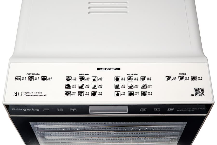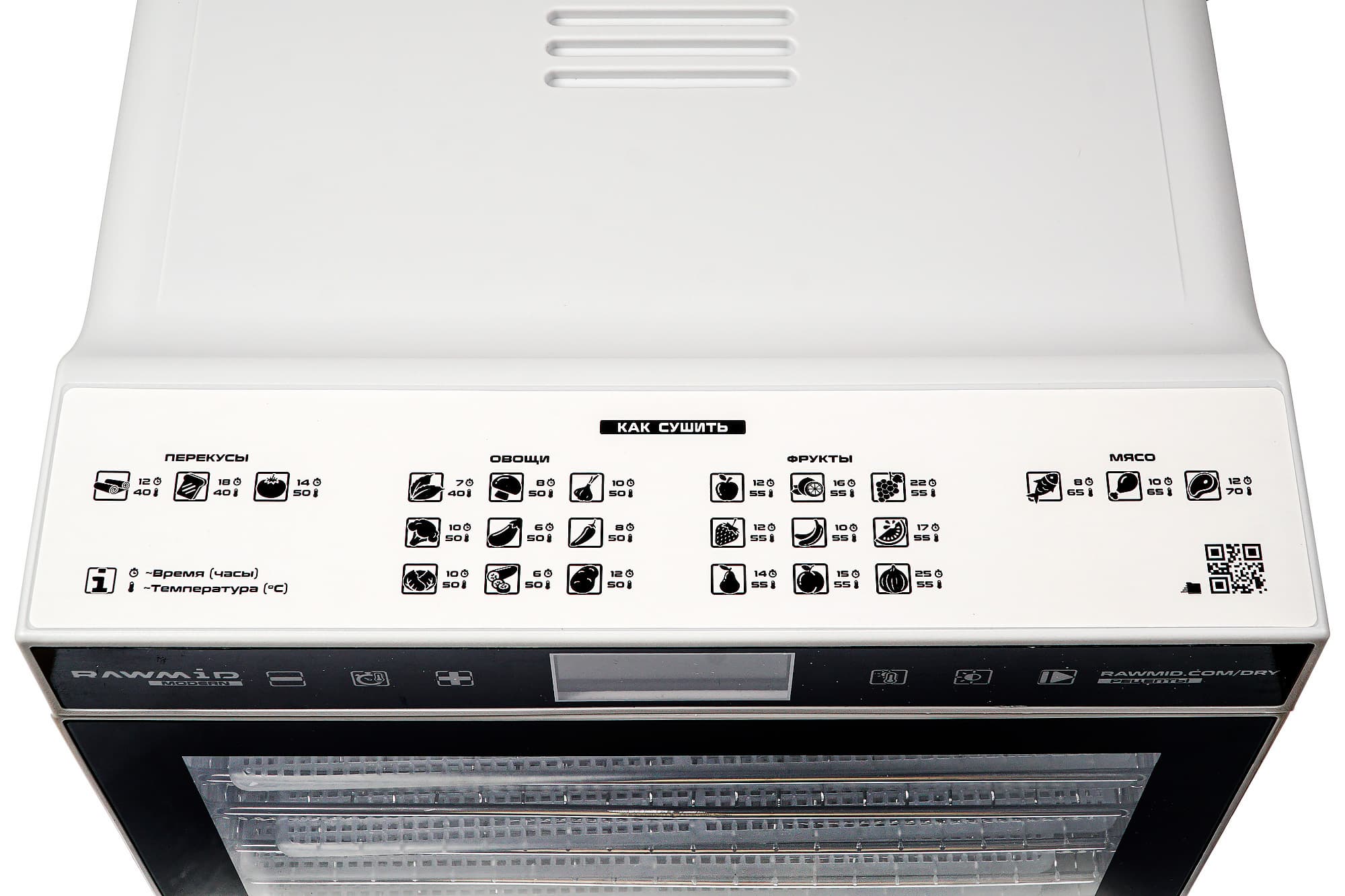 Сверху на корпусе расположены подсказки для удобства пользователя, а также QR-код, который при сканировании приводит на сайт rawmid.com в раздел «Руководство по сушке продуктов в дегидраторе» Там мы видим таблицы сушки и ссылки на YouTube-обзоры рецептов. Очень удобно.