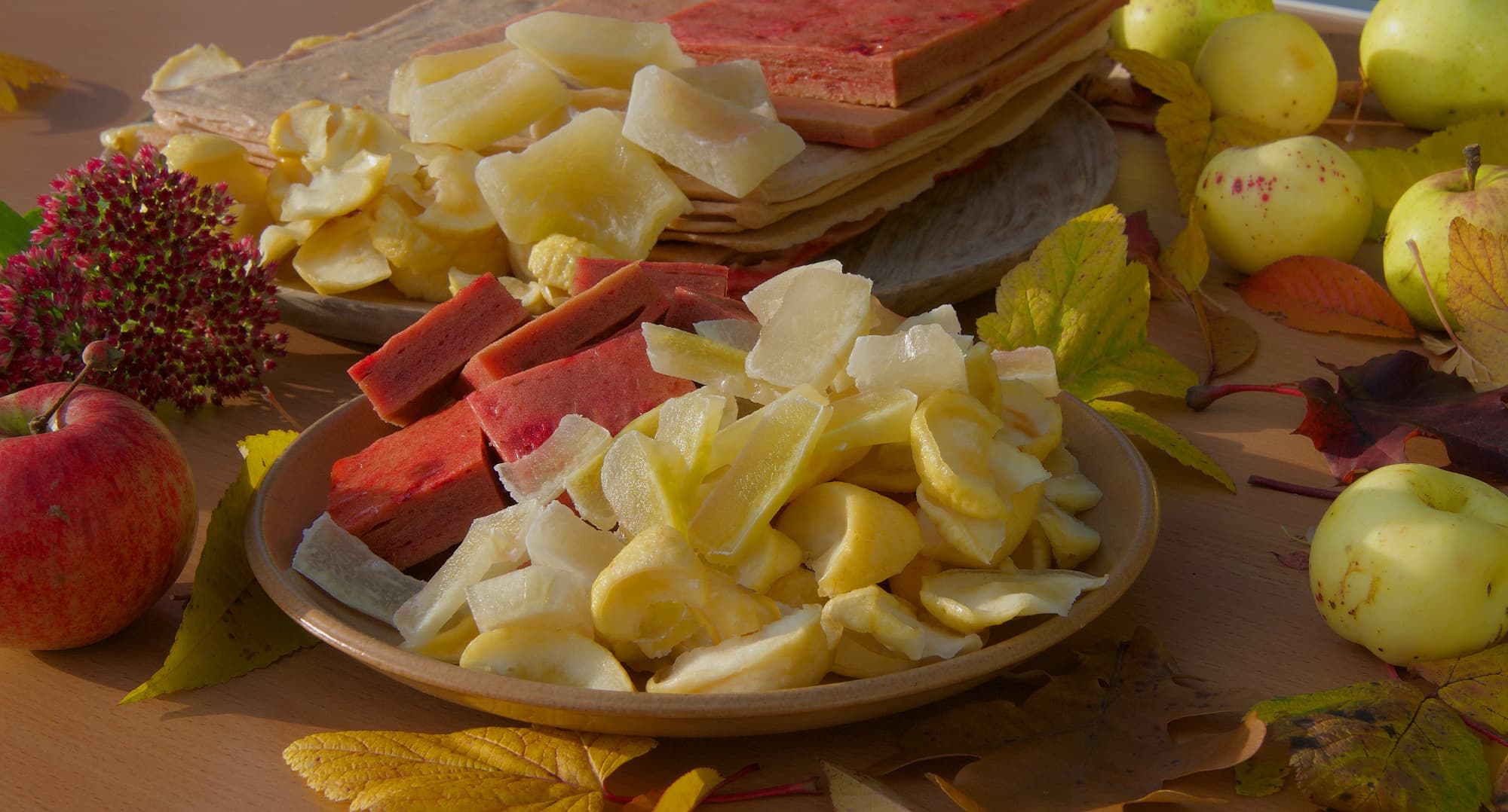 По этому же рецепту мы пытались обработать яблоки твердых осенних сортов. Но яблоки более деликатный фрукт, и они все время пытались превратиться в пюре — мы зачем-то поставили их на температуру 80 °C и практически испекли. Было решено продержать их в сиропе около двух дней, после этого промыть и отправить в дегидратор на 8 часов при 60 °C.