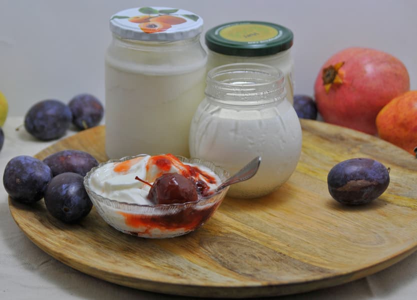 Мы взяли фермерское свежее молоко и две баночки Имунеле для закваски. Молоко нагрели до 40 °C, разлили по банкам, влили понемногу закваски, поставили при 45 °C на 6 часов в дегидратор. Крышками не закрывали. Через 6 часов достали, сняли образовавшуюся обветренную корочку сверху, закрыли крышками и отправили йогурт в холодильник. Через несколько часов йогурт приобрел плотную текстуру и был готов к употреблению.