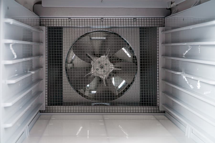 Внутри мы видим нагревательную спираль и большой пятилопастной вентилятор, находящийся за металлической сеткой. То есть, нам не надо бояться, что какой-то продукт может неудачно попасть с лотка на лопасти — сетка с достаточно мелкой ячейкой, чтобы этого не произошло. Пластик внутри глянцевый, мыть и чистить его будет удобно. Направляющие для лотков не имеют возможности менять положение.