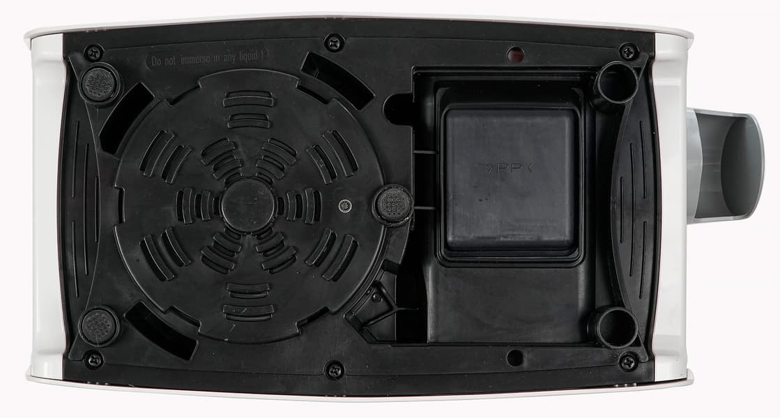 На дне нет ничего интересного: вентиляционные отверстия, пять ножек, три из которых оснащены резиновыми накладками. Ножки приподнимают корпус над поверхностью стола примерно на один сантиметр. Кстати, с правой и левой стороны в корпусе имеются выемки, держась за которые, удобно переносить маслопресс с места на место.