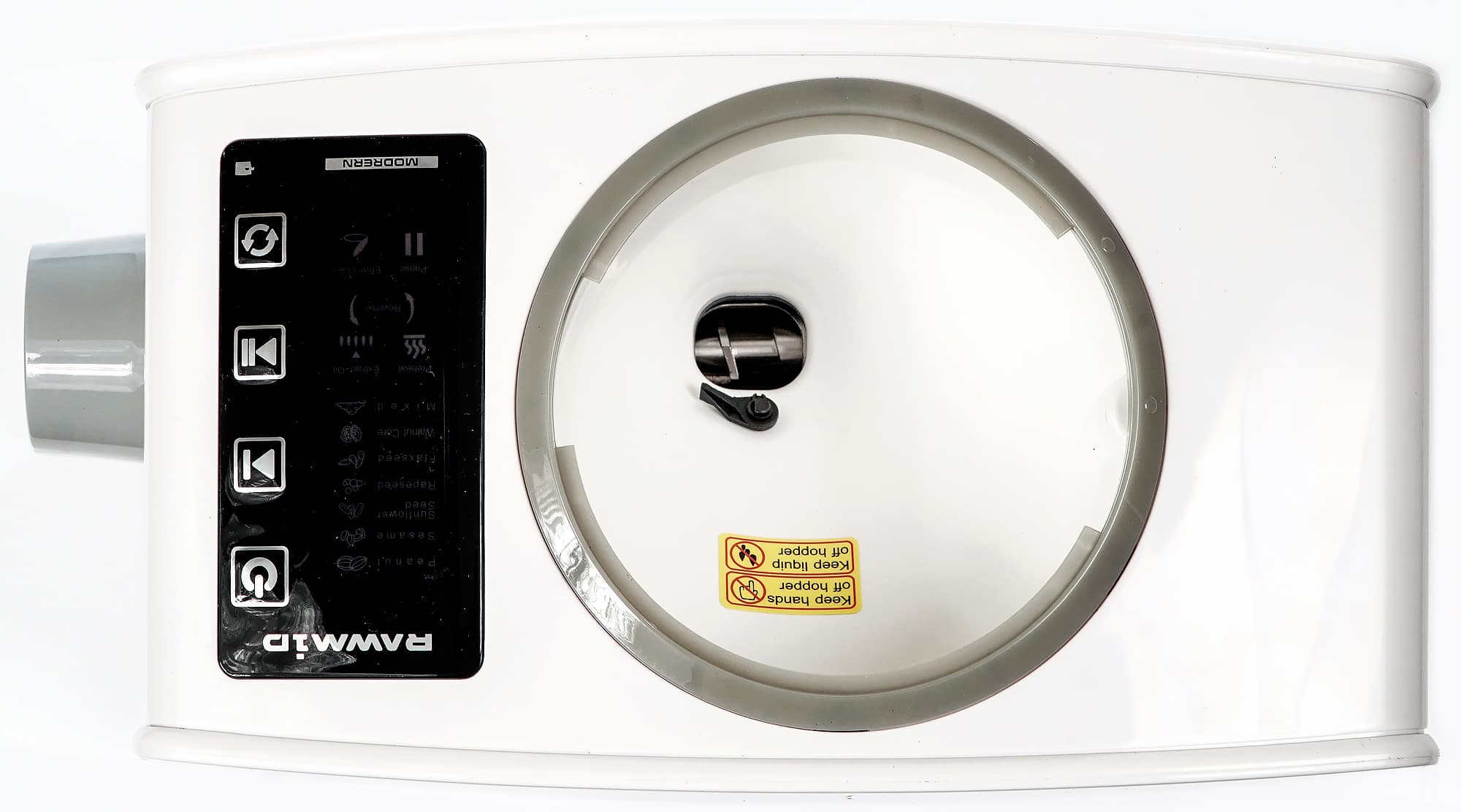 Также как и в рассмотренных ранее моделях, маслопресс Rawmid Modern RMO-03 не начнет работу, если на загрузочную камеру не надета крышка. Во время работы пресса крышку запрещено поднимать — в противном случае вращение шнека останавливается. Крайне удобна функция автоматического отключения: через одну минуту холостого хода останавливается шнек, через пять минут выключается прибор.