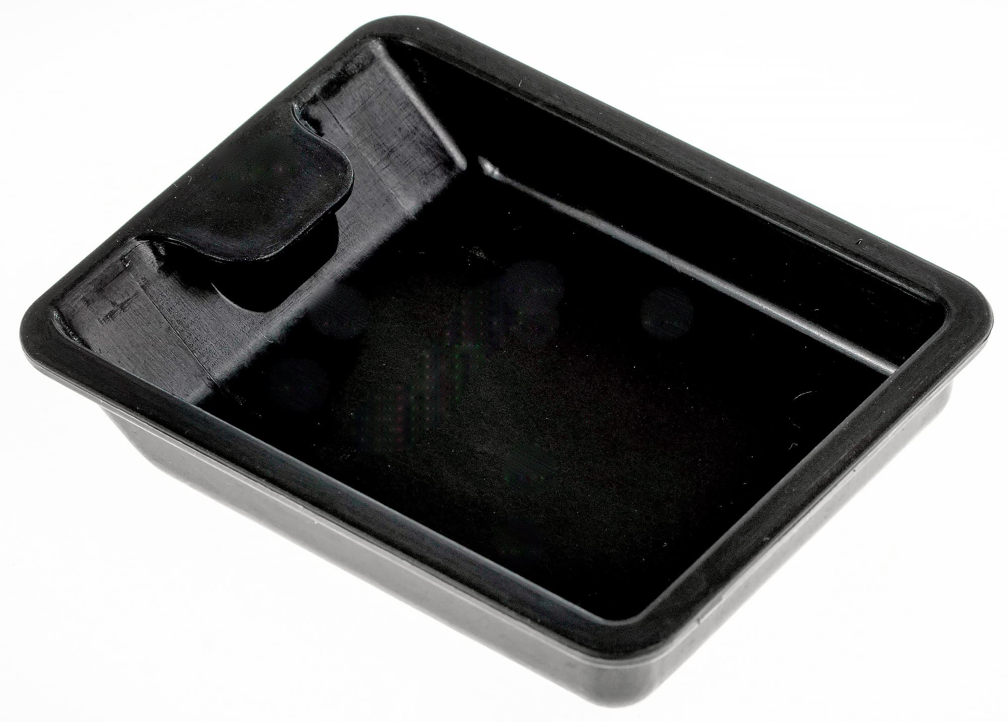 Теперь обратим внимание на отверстие в корпусе, предназначенное для размещения маслосборника. На дно устанавливается поддон. Деталь изготовлена из пластика черного цвета. Поддон съемный. Размещается на дне надежно, извлекается без проблем двумя пальцами, чему помогает небольшой выступ в виде язычка в верхней части.