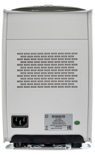 При первом же взгляде на Rawmid Modern RMO-03 удивляет его размер. Прибор невелик для маслопресса и представляет собой аккуратный параллелепипед со скругленными углами. Лаконичная форма вкупе с качественным пластиком производят самое хорошее впечатление. Аппарат изготовлен и собран очень аккуратно — все стыки плотные, без щелей. Пластик гладкий, с глянцевой поверхностью.