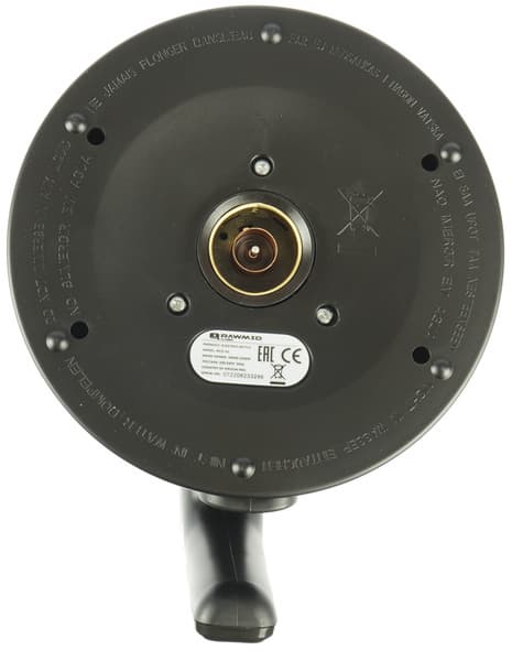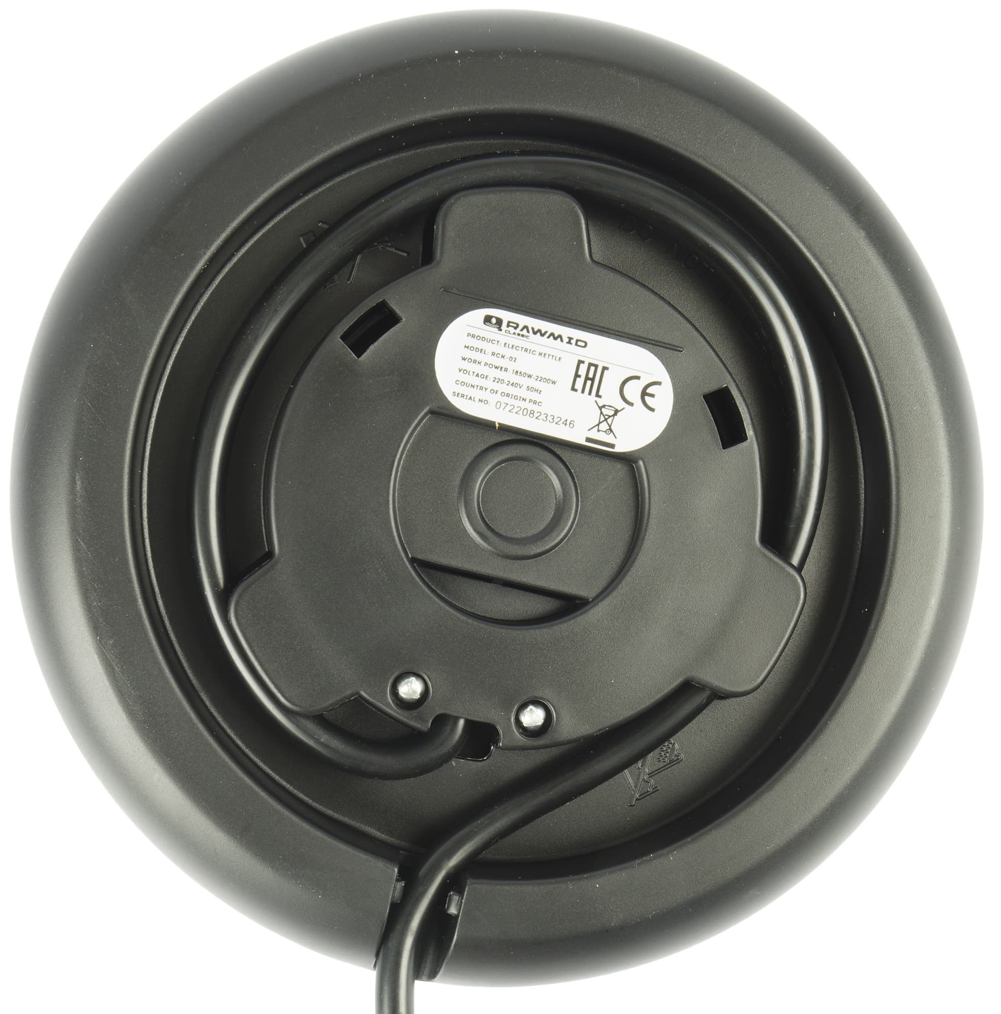 На черном пластиковом корпусе электрочайника Rawmid RCK-02 выделяются серебристые металлические элементы: ободок внутренней колбы и носик из нержавеющей стали. В нижней части размещен серебристый логотип «Rawmid Classic»: действительно, конструкция выглядит классической и строгой.