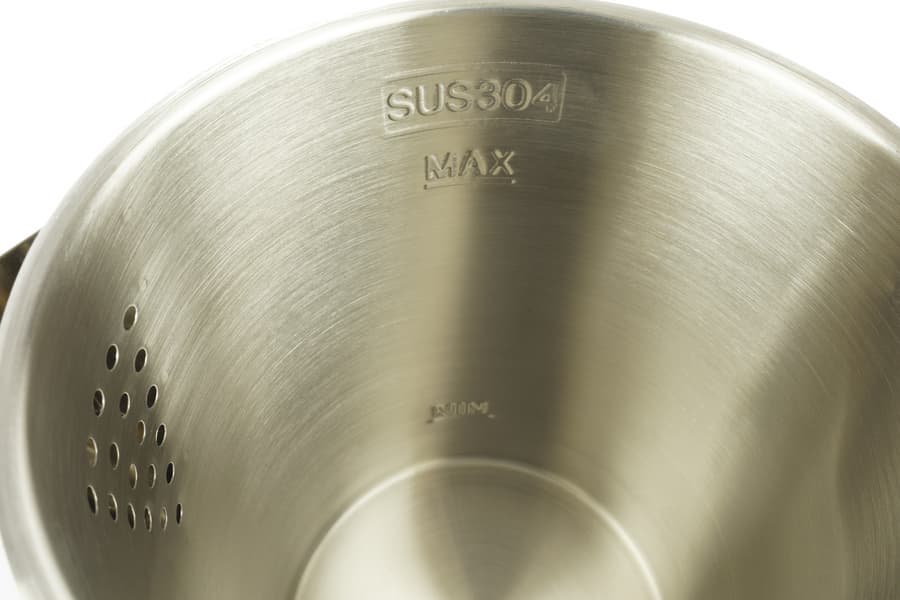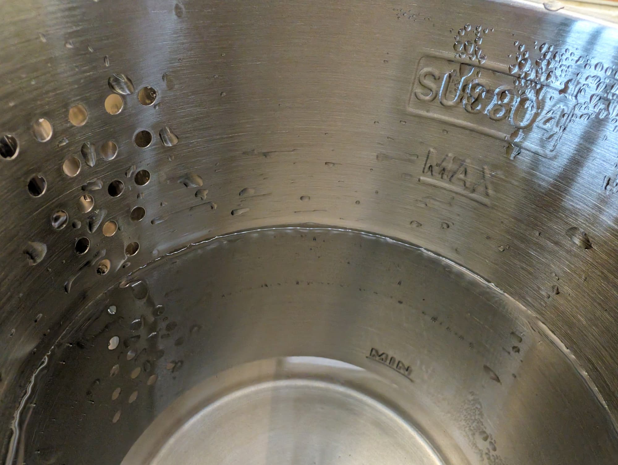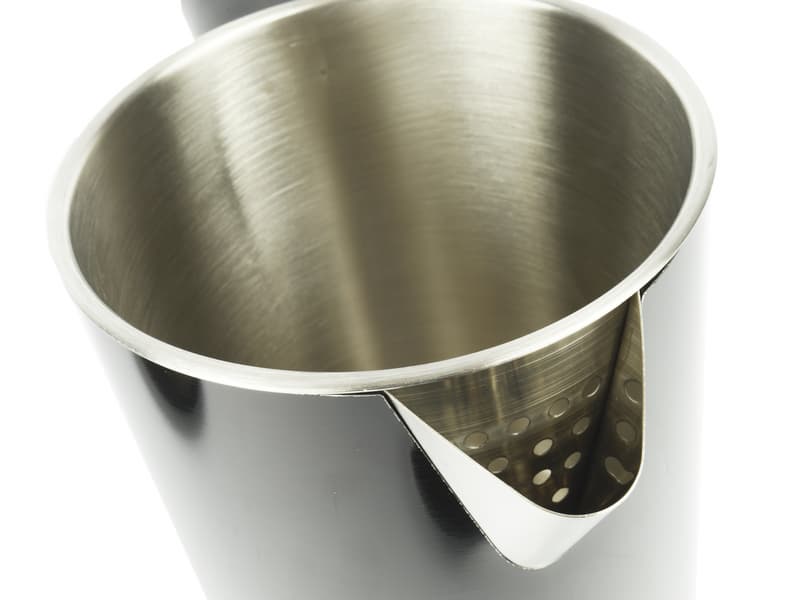 Двухслойная конструкция призвана повысить теплоизолирующие свойства чайника и снизить шум при закипании. Внутренняя поверхность емкости выполнена из нержавеющей стали SUS304. В стальном носике — решетка с довольно крупными отверстиями.